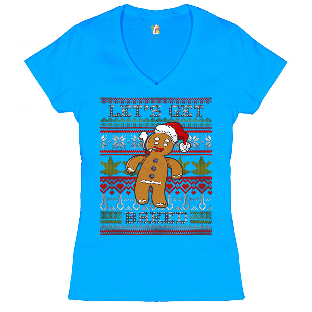 LET'S GET BAKED women's v-neck t-shirt ugly sweater gingerbread man 420 tee turquoise