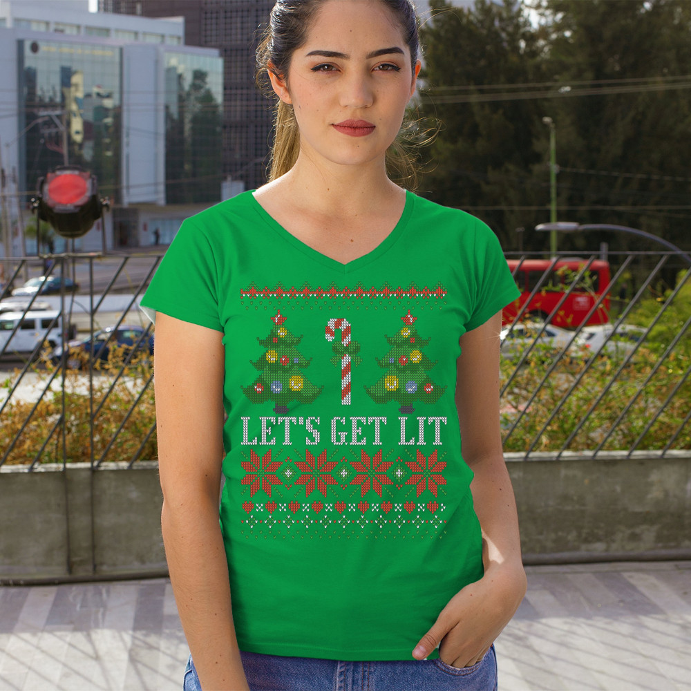 LET'S GET LIT women's v-neck t-shirt ugly sweater christmas candy cane tee green
