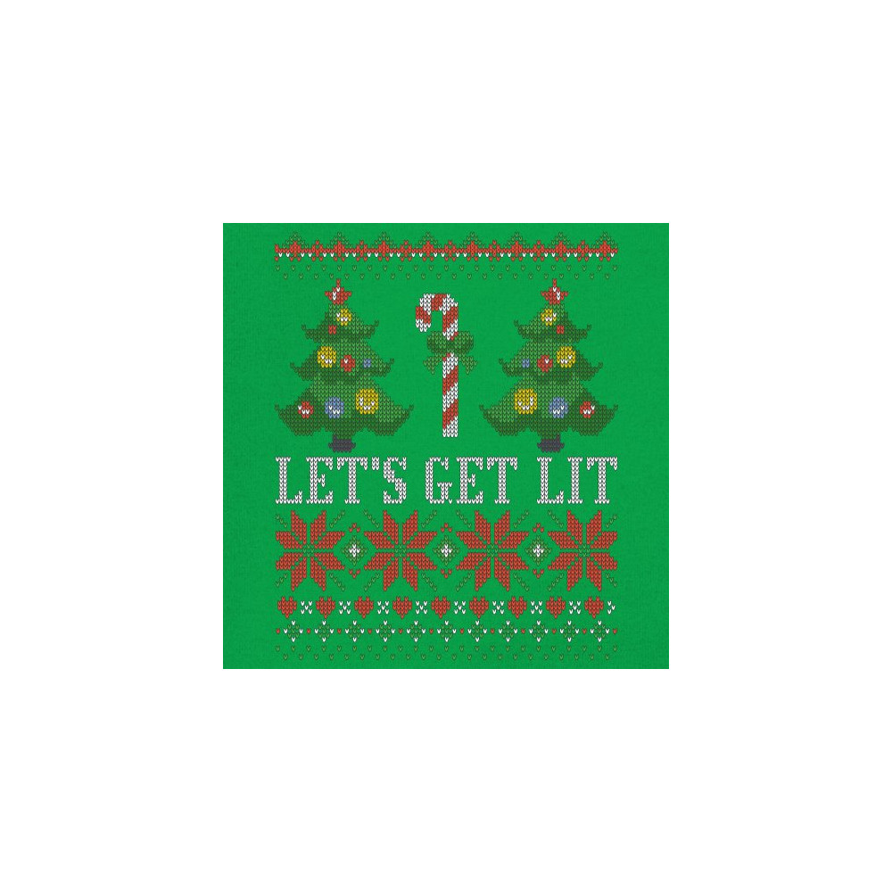 A print saying: "Let's Get Lit" and depicting two Christmas trees and a candy cane between them. The print is decorated as an ugly sweater. A great choice for a Christmas eve celebration.