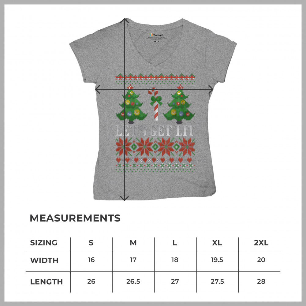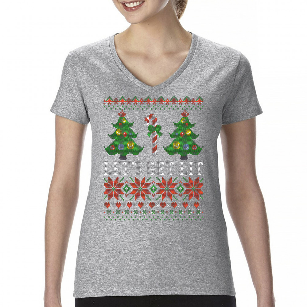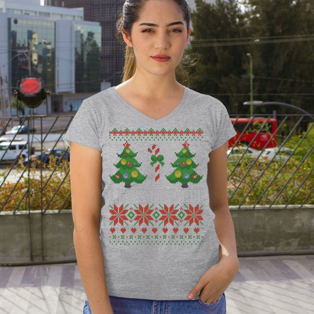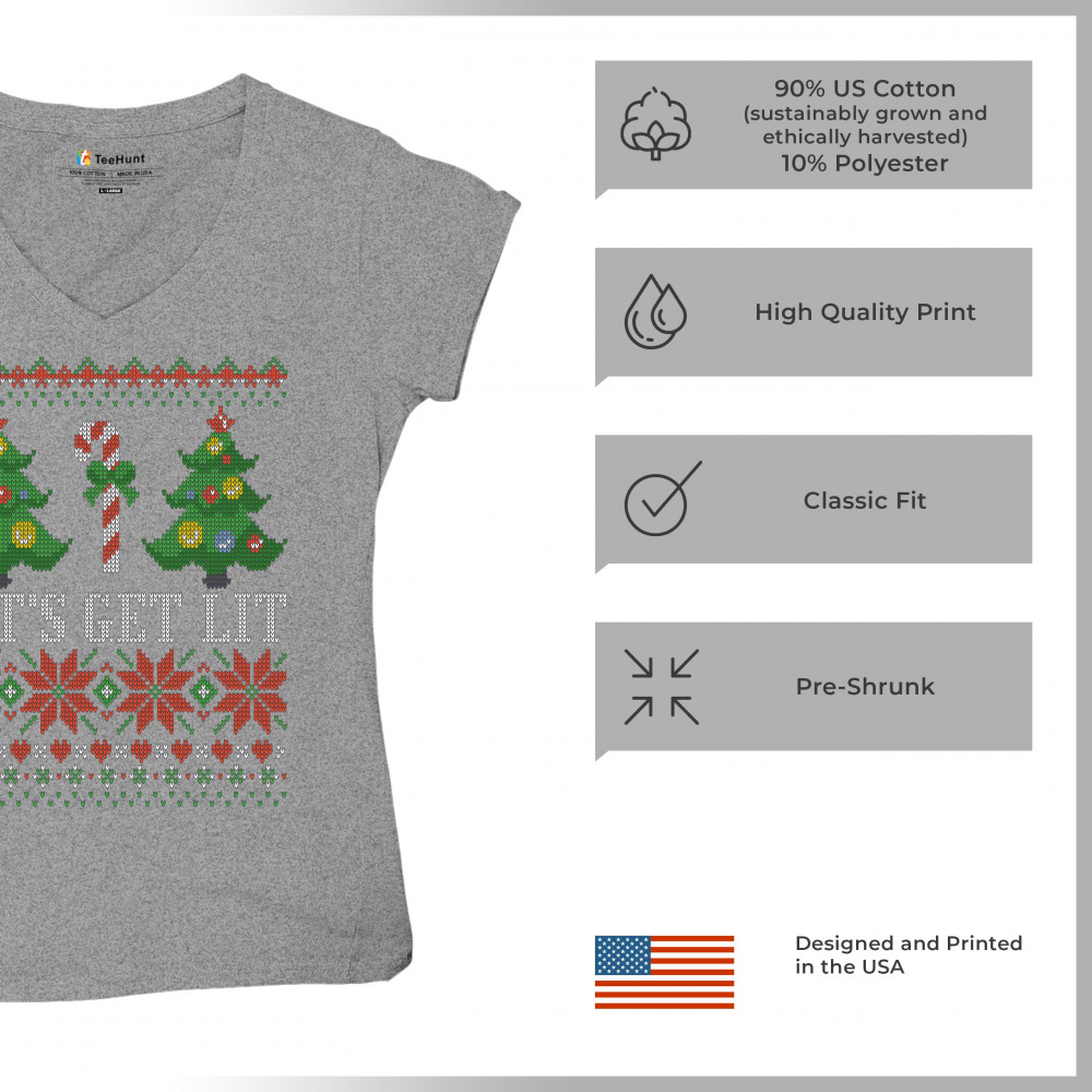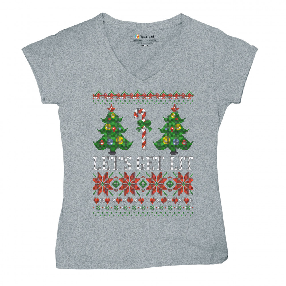 LET'S GET LIT women's v-neck t-shirt ugly sweater christmas candy cane tee gray