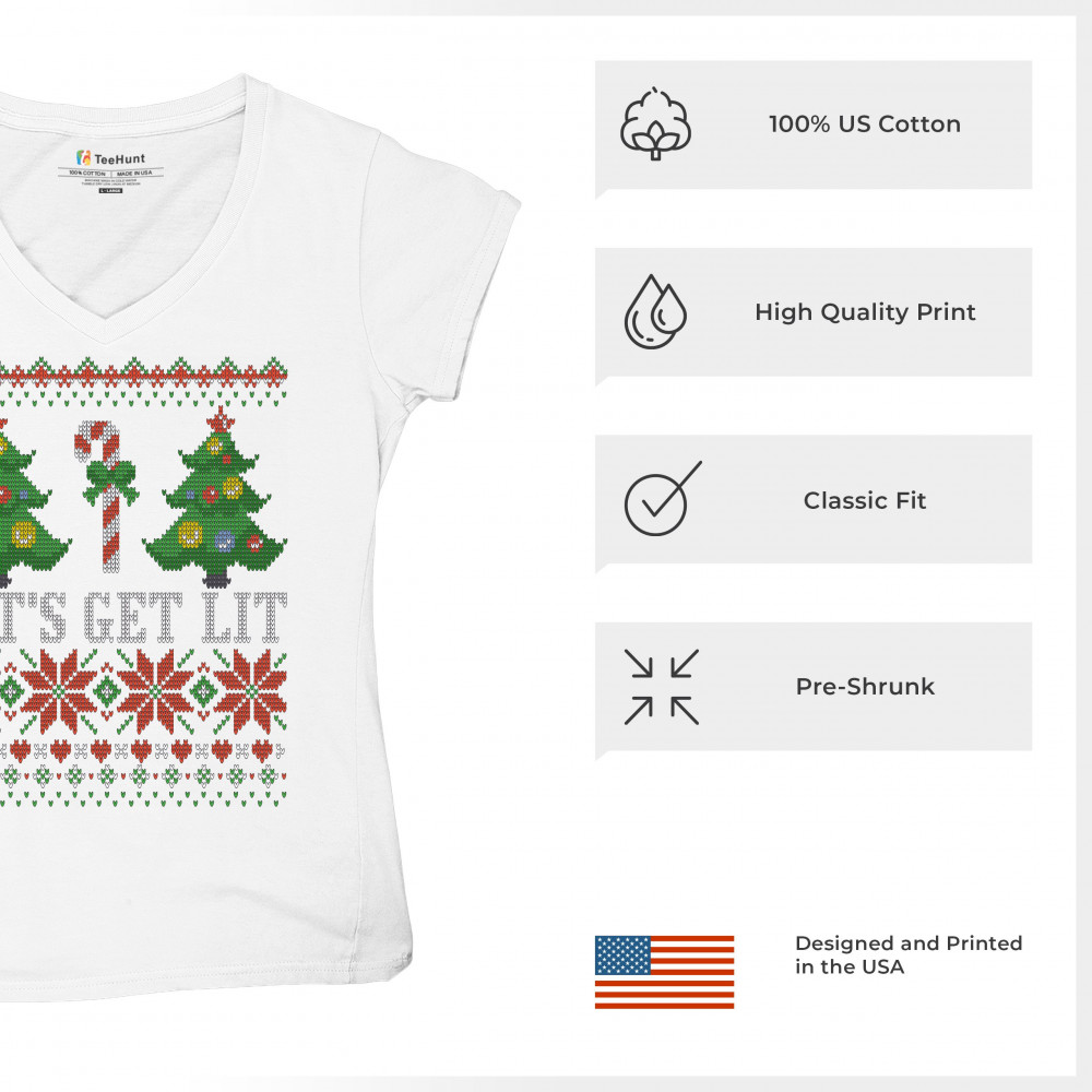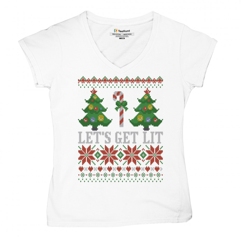 LET'S GET LIT women's v-neck t-shirt ugly sweater christmas candy cane tee white
