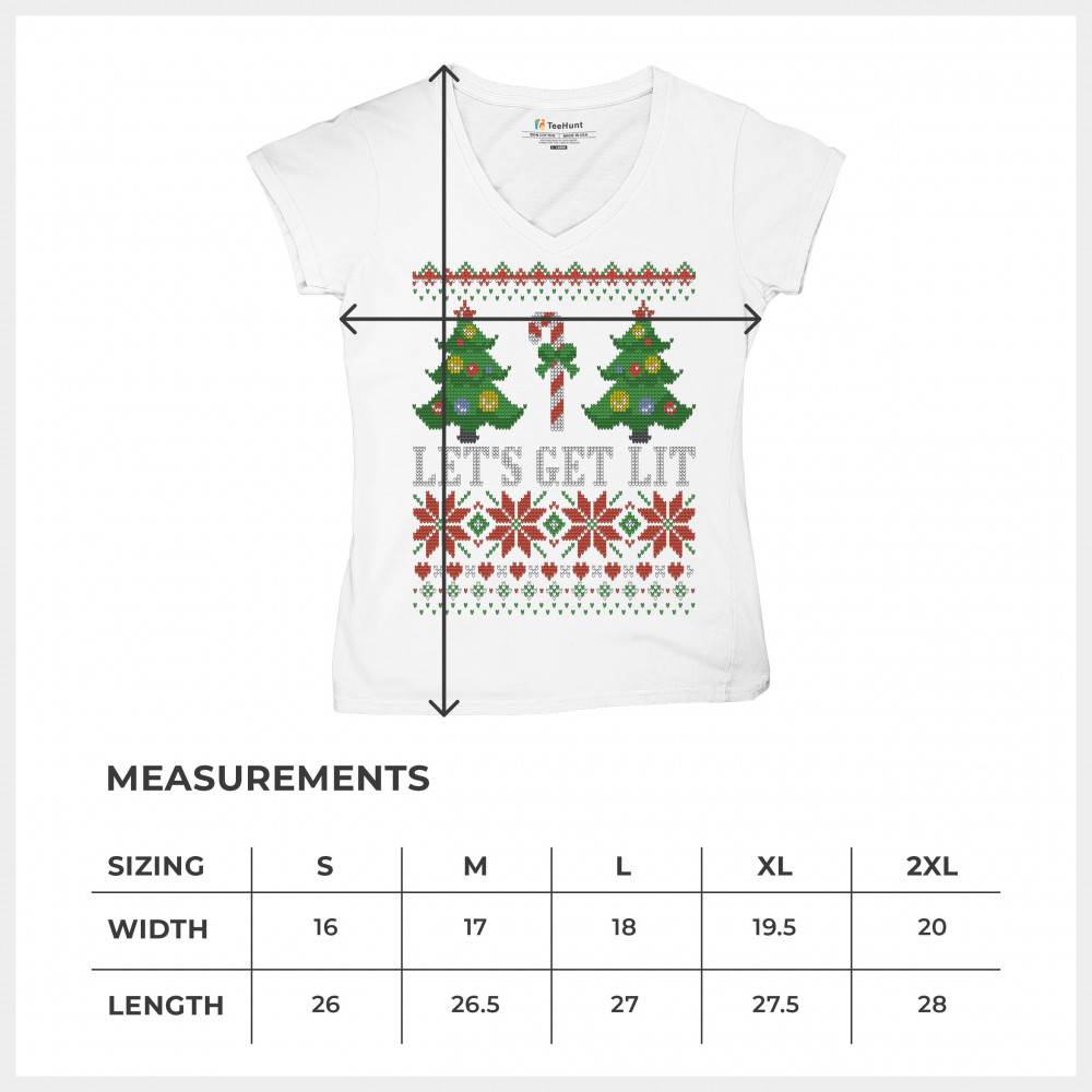 A print saying: "Let's Get Lit" and depicting two Christmas trees and a candy cane between them. The print is decorated as an ugly sweater. A great choice for a Christmas eve celebration.