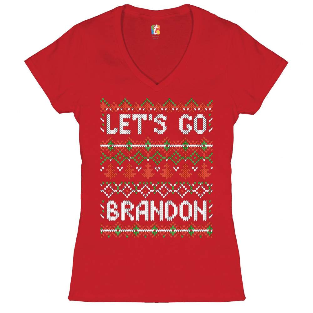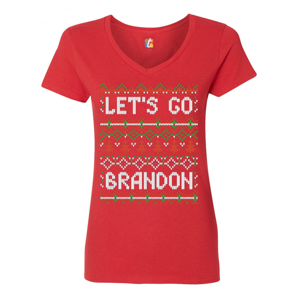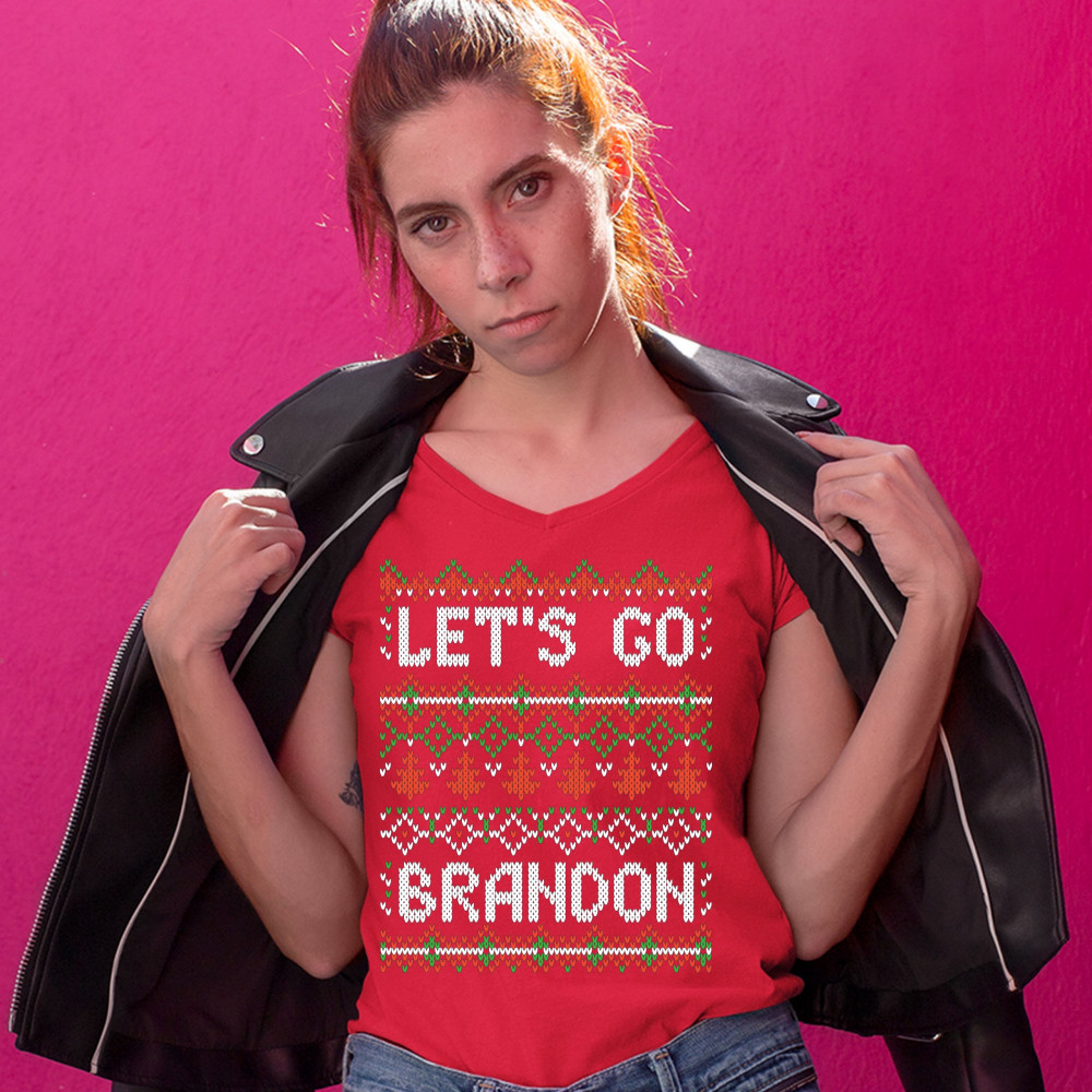 LET'S GO BRANDON women's v-neck t-shirt ugly sweater christmas anti biden tee red