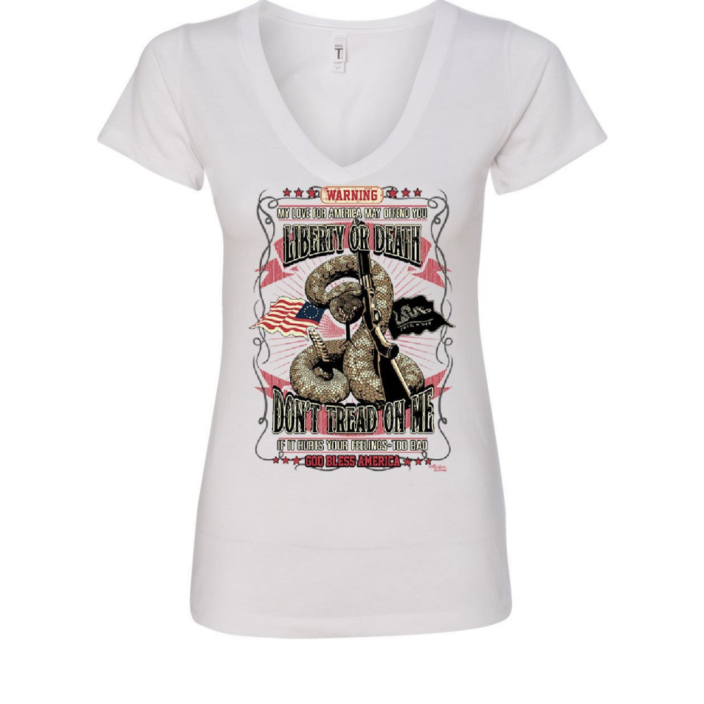 LIBERTY OR DEATH DON'T TREAD ON ME women's v-neck t-shirt gadsden flag america white