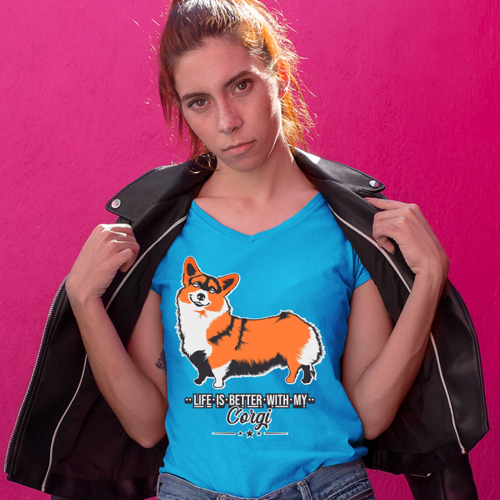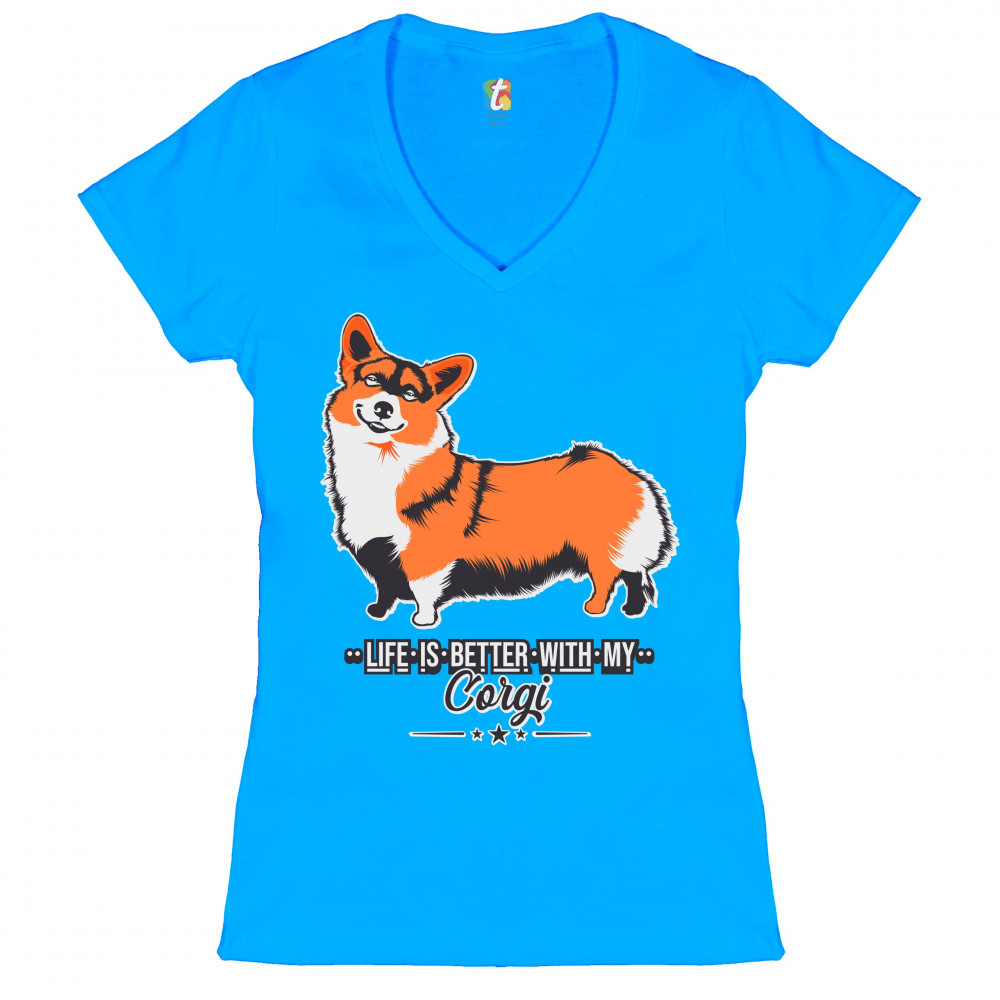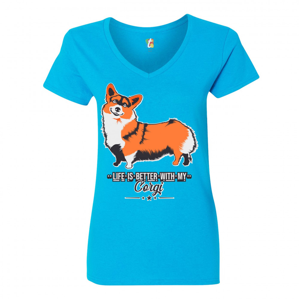 LIFE IS BETTER WITH MY CORGI women's v-neck t-shirt best friend dog lover tee turquoise