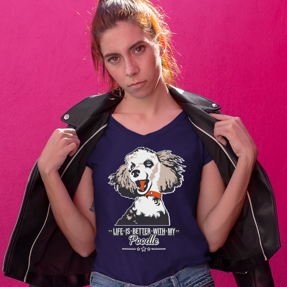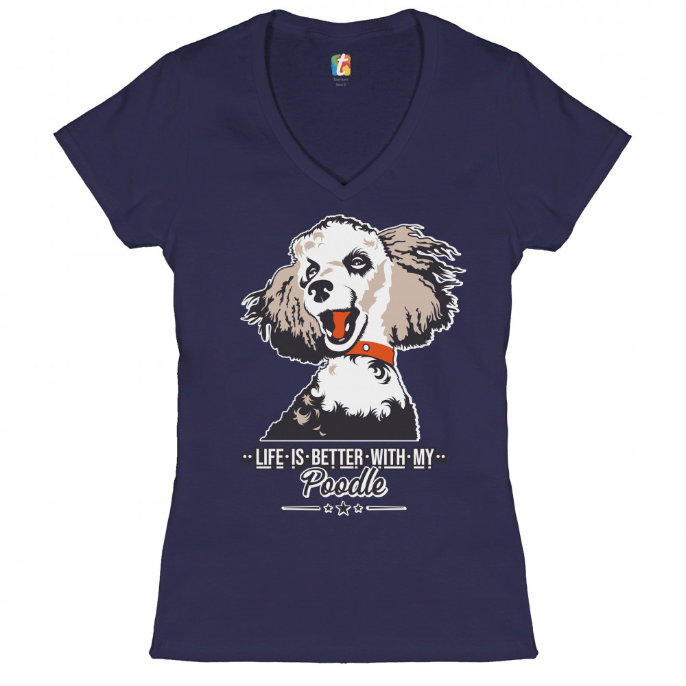 LIFE IS BETTER WITH MY POODLE women's v-neck t-shirt cute puppy dog lover tee navy blue
