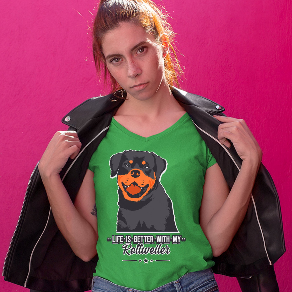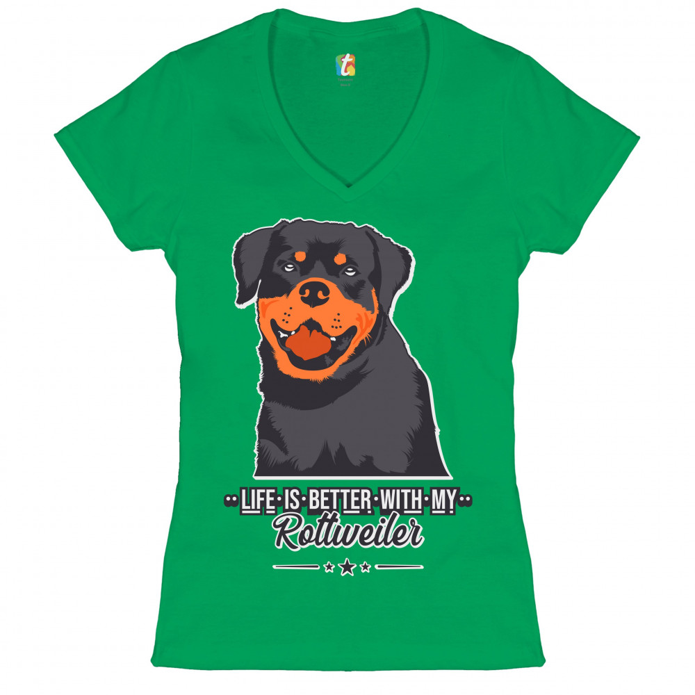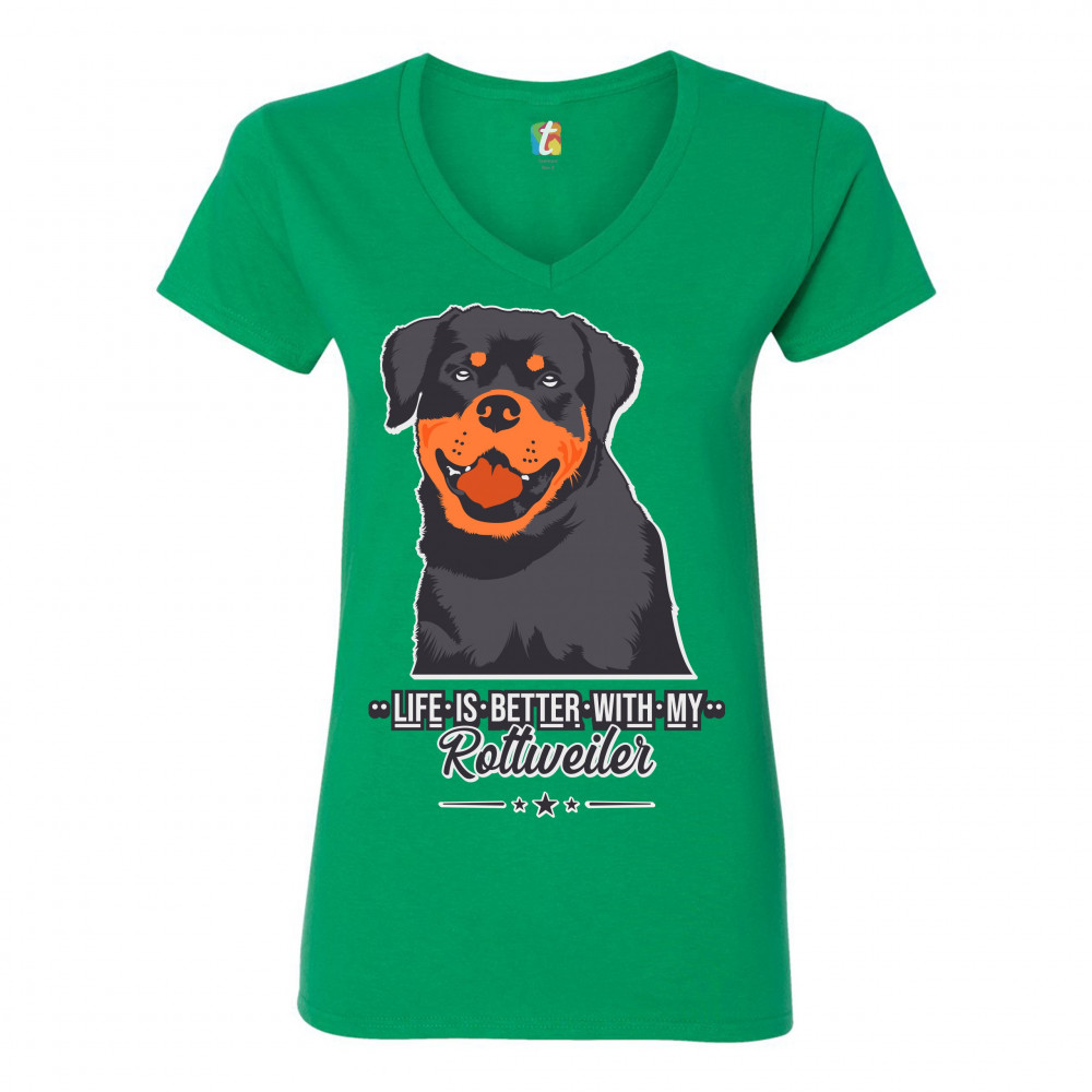 LIFE IS BETTER WITH MY ROTTWEILER women's v-neck t-shirt dog lover rottie tee green