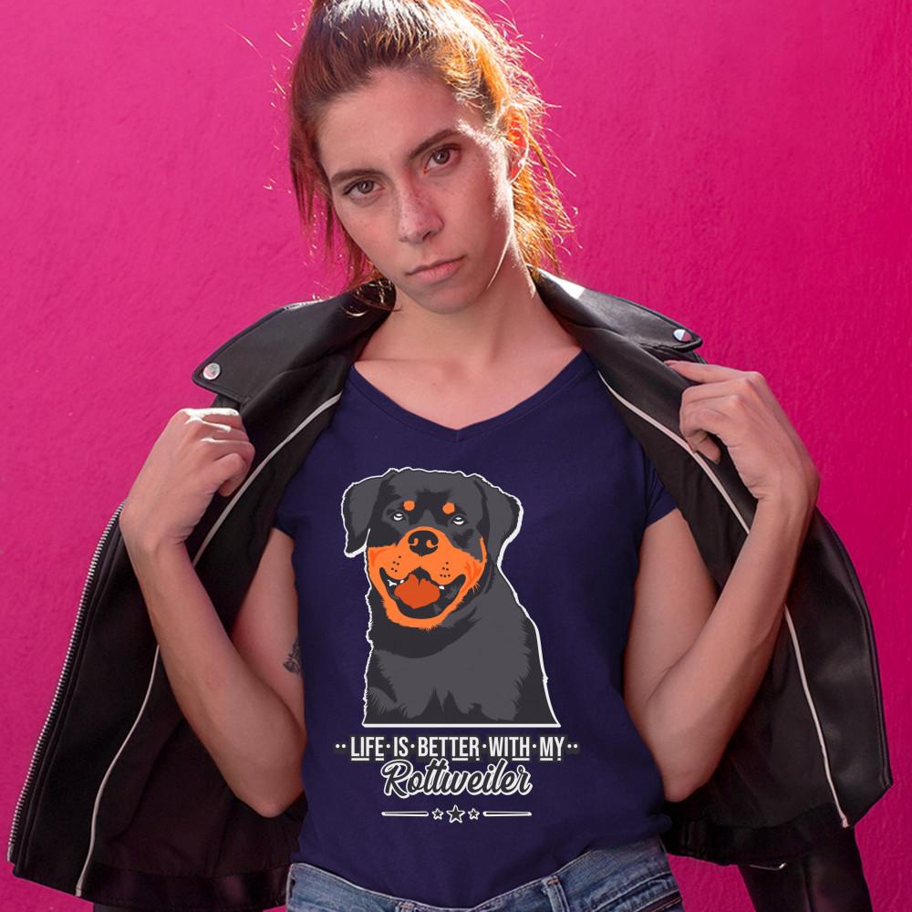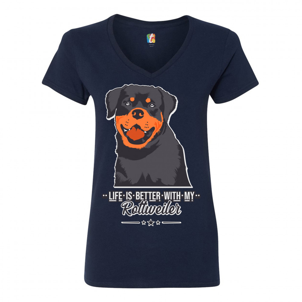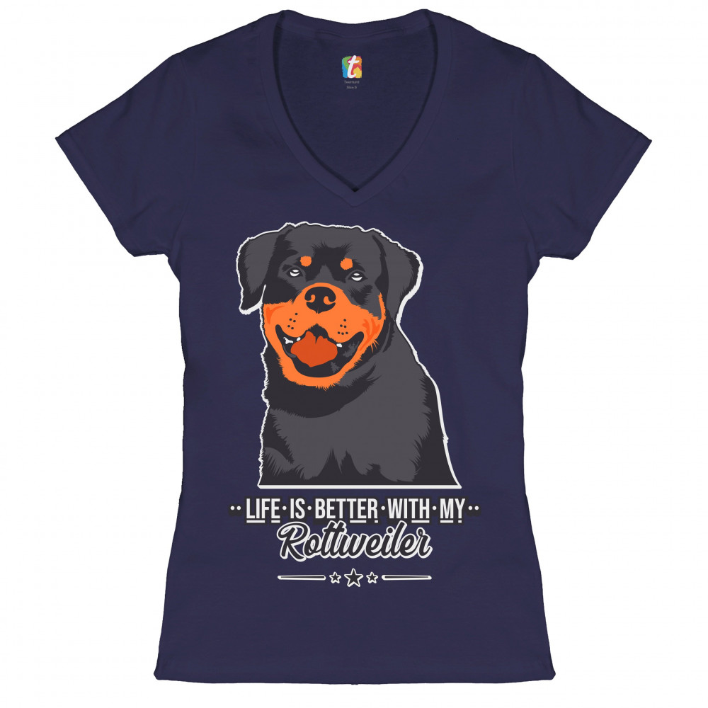 LIFE IS BETTER WITH MY ROTTWEILER women's v-neck t-shirt dog lover rottie tee navy blue