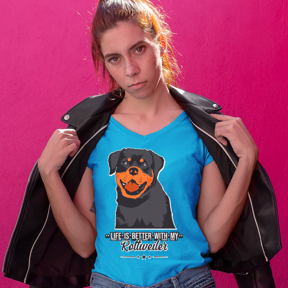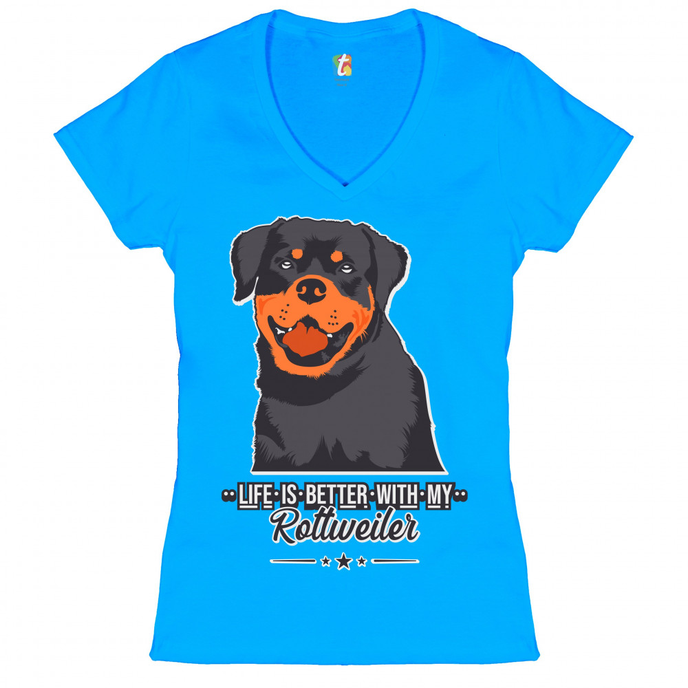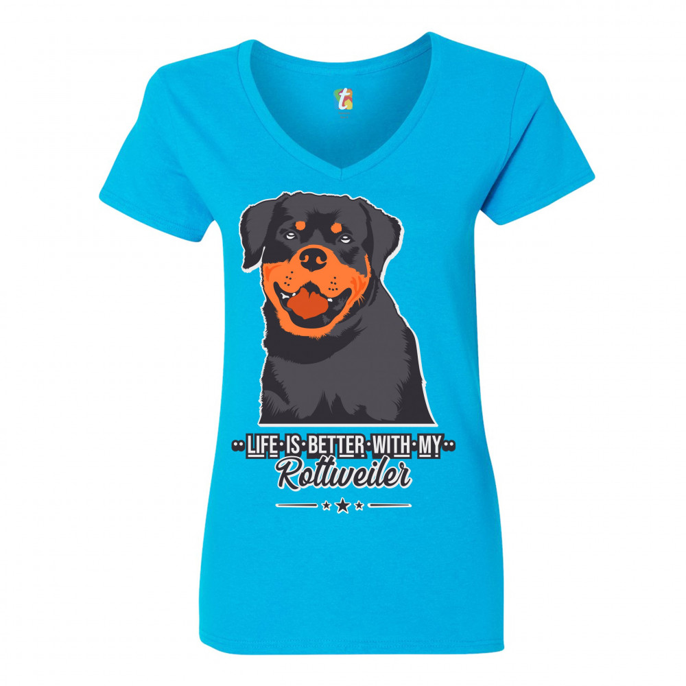 LIFE IS BETTER WITH MY ROTTWEILER women's v-neck t-shirt dog lover rottie tee turquoise
