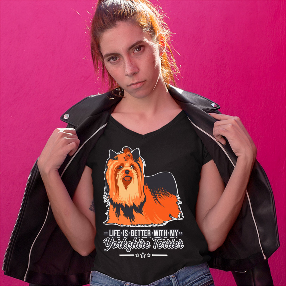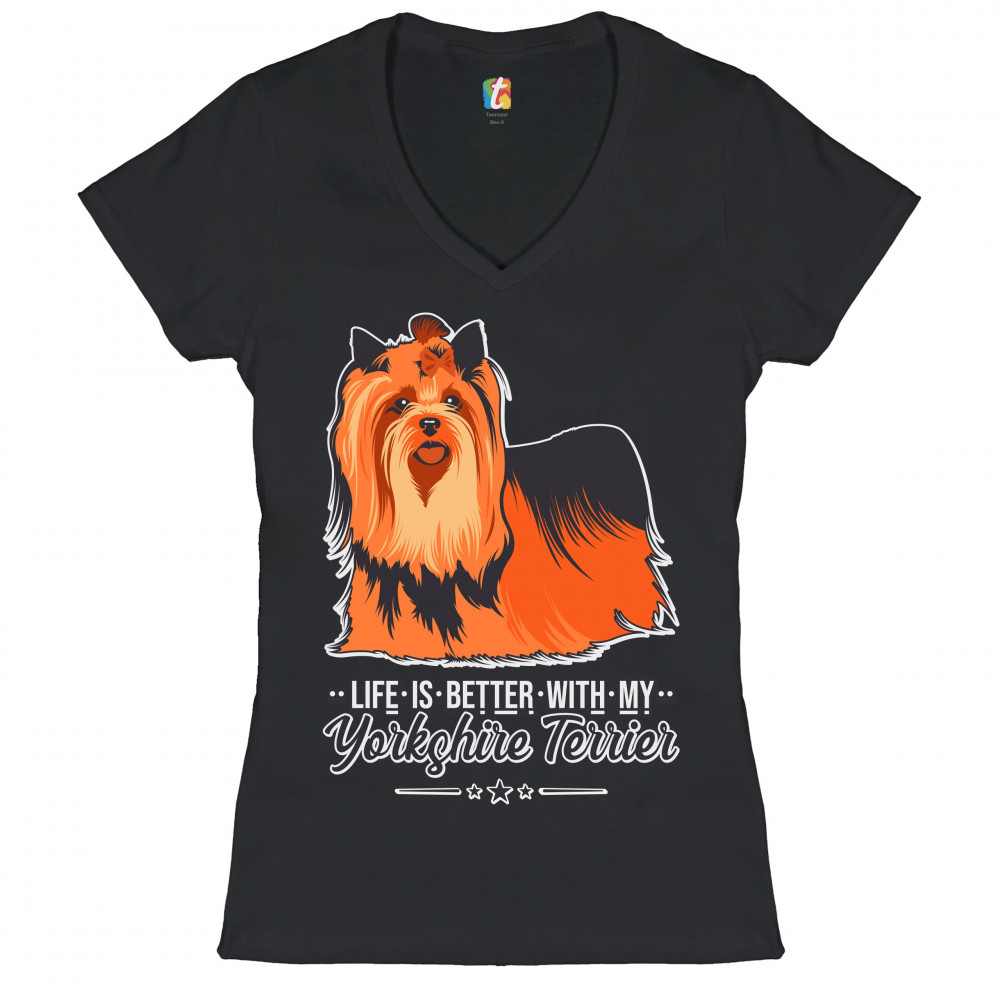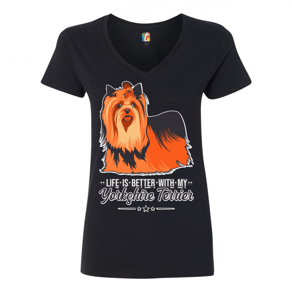 LIFE IS BETTER WITH MY YORKSHIRE TERRIER women's v-neck t-shirt yorkie dog tee black