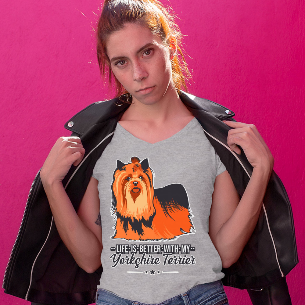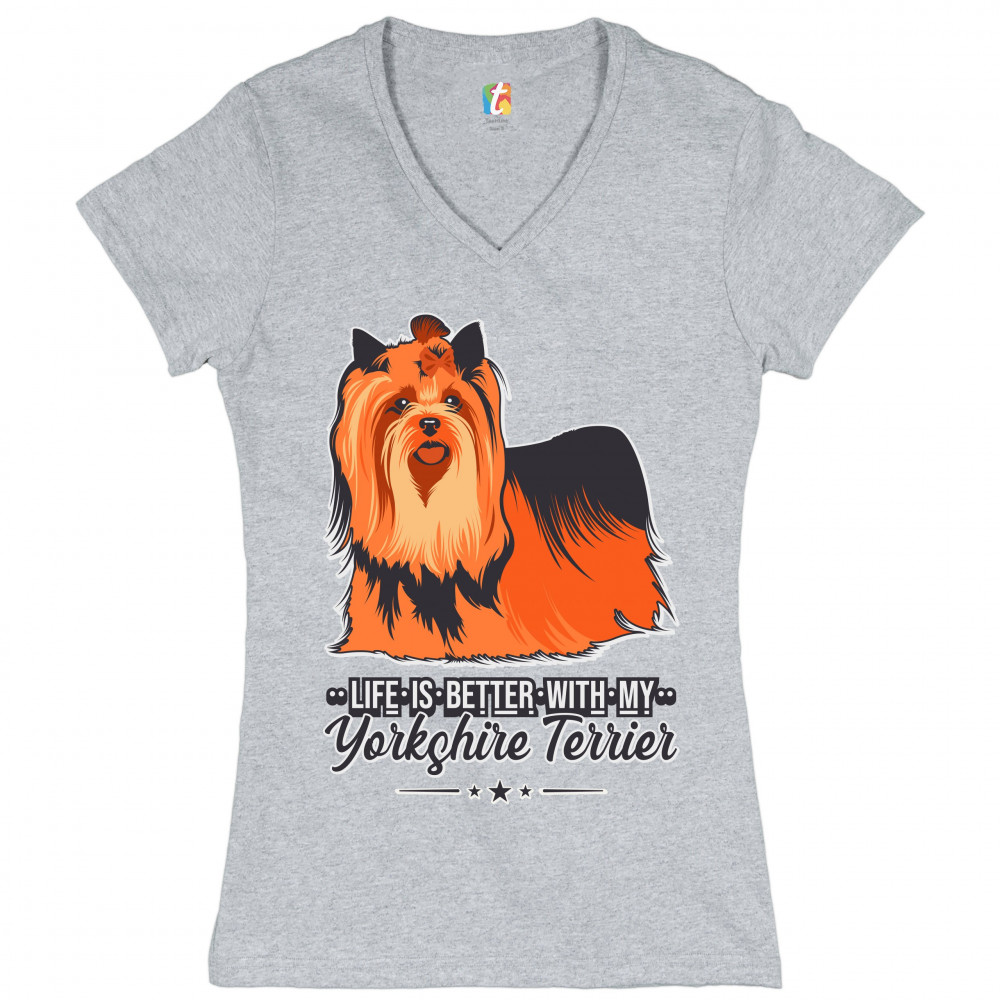 LIFE IS BETTER WITH MY YORKSHIRE TERRIER women's v-neck t-shirt yorkie dog tee gray