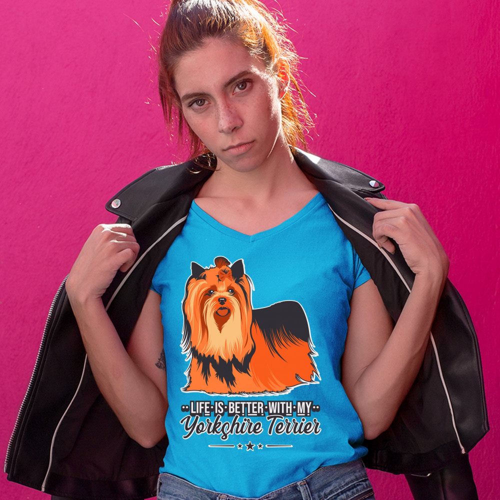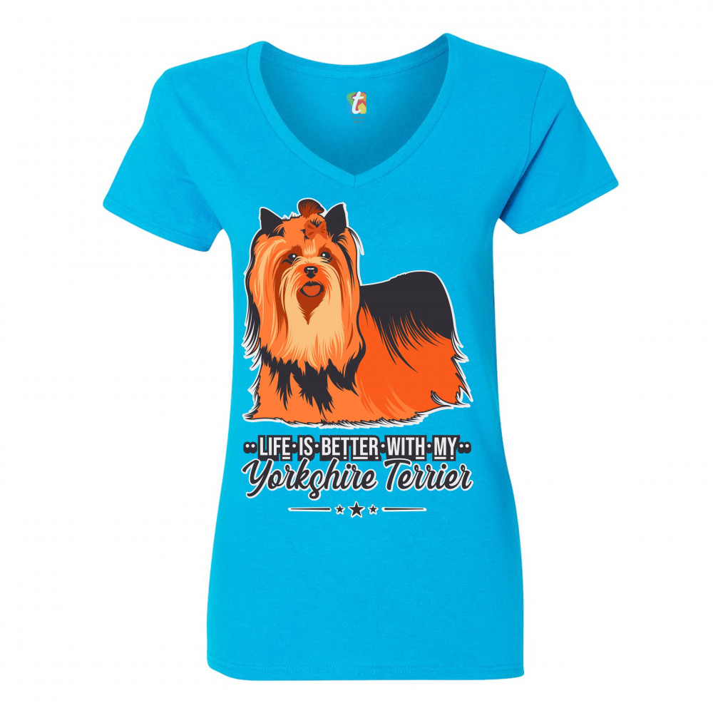 LIFE IS BETTER WITH MY YORKSHIRE TERRIER women's v-neck t-shirt yorkie dog tee turquoise