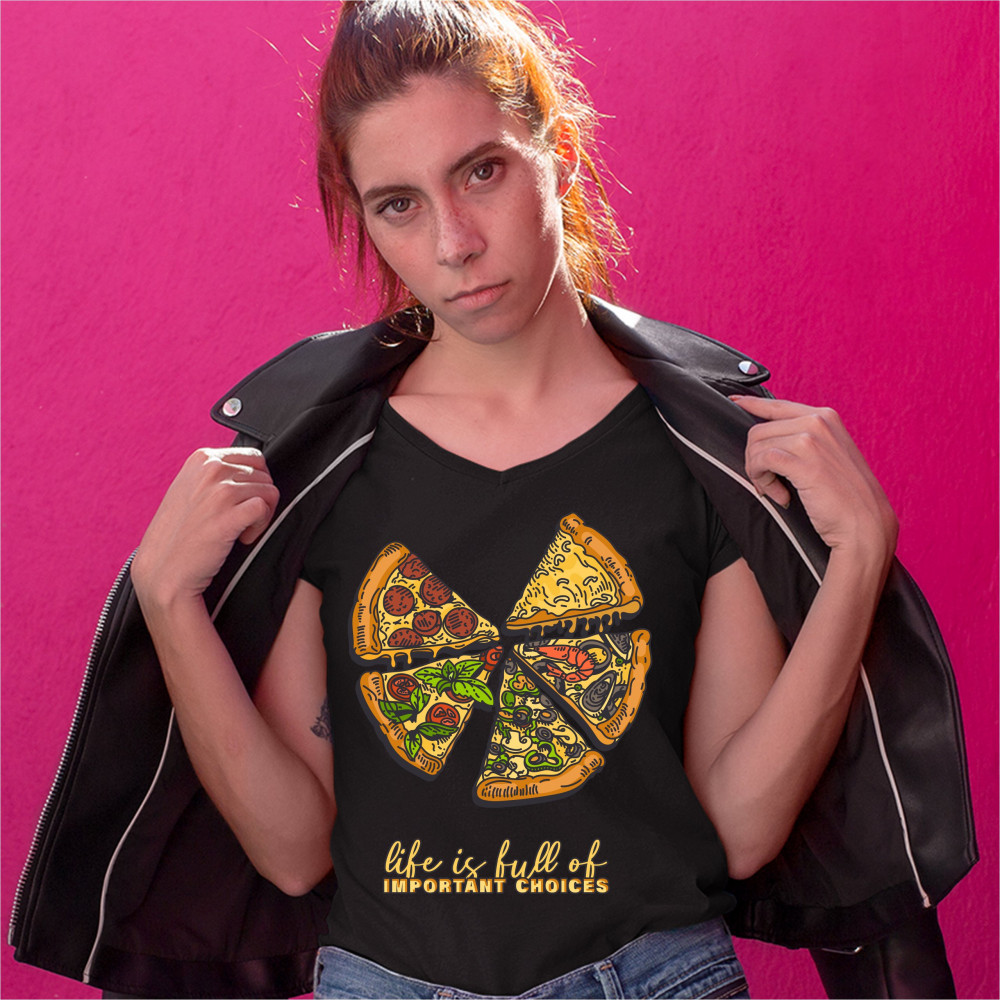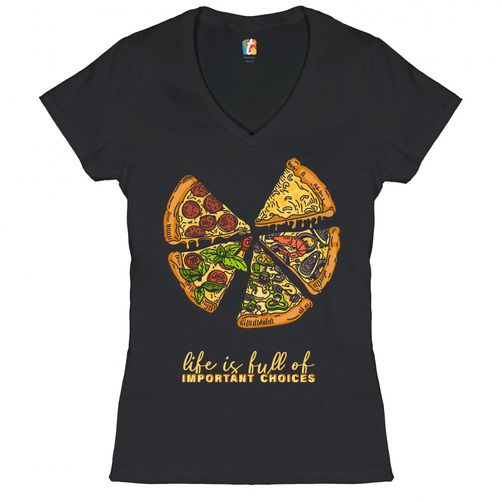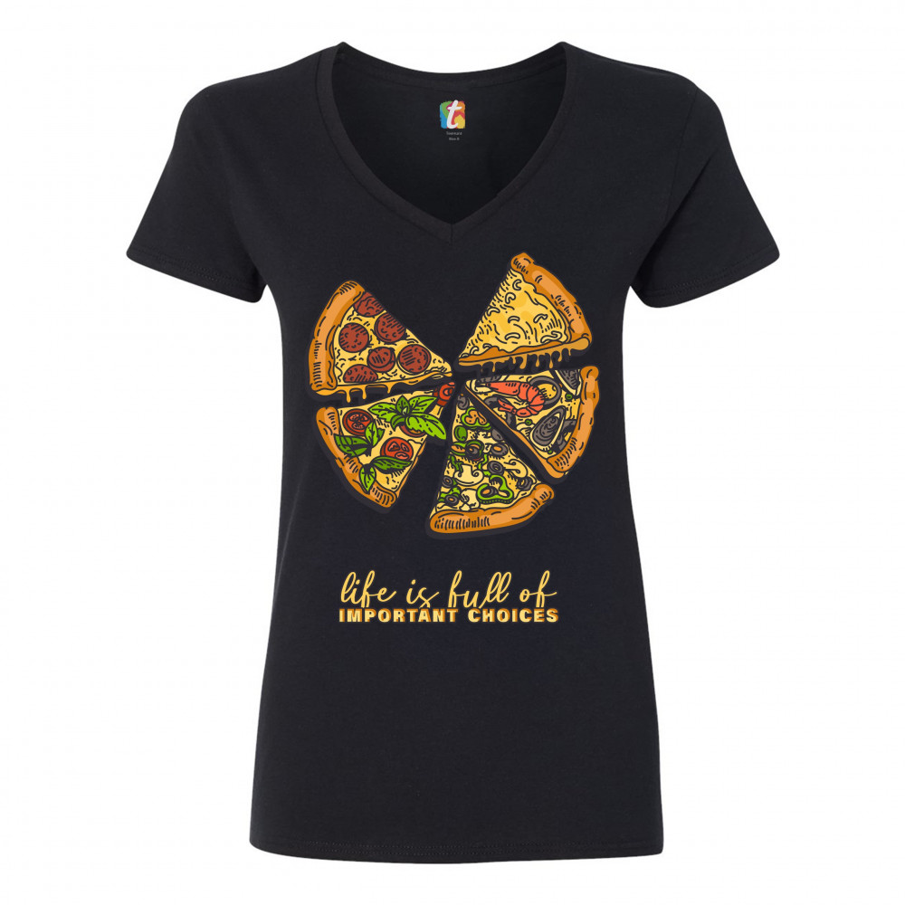 LIFE IS FULL OF IMPORTANT CHOICES women's v-neck t-shirt pepperoni pizza tee black