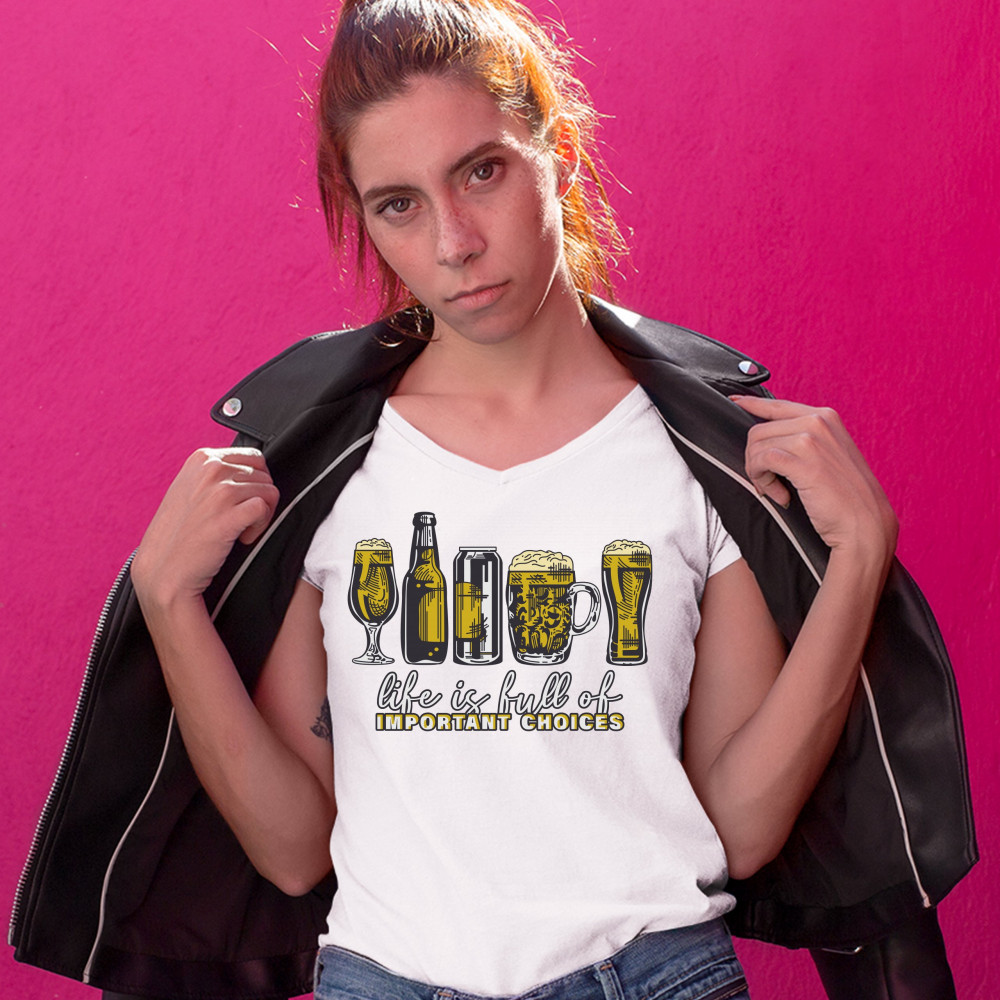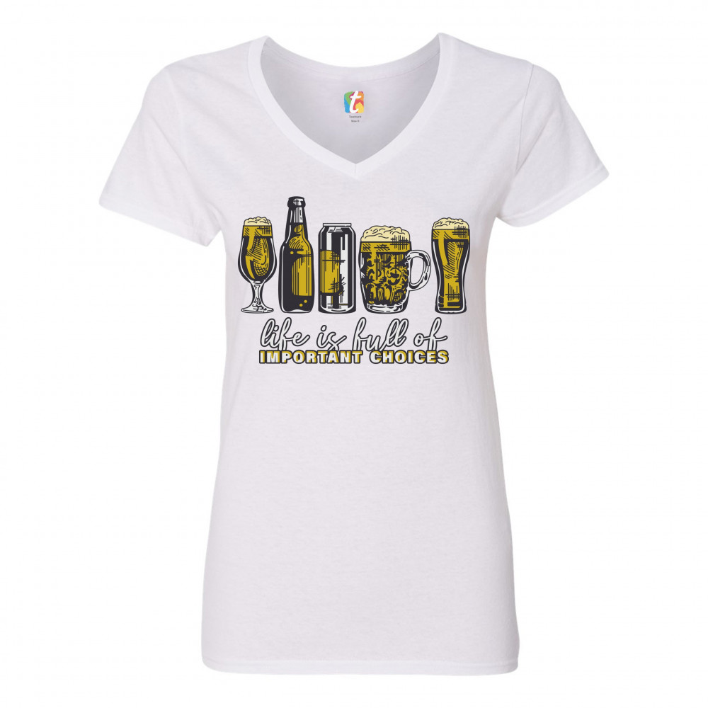 LIFE IS FULL OF IMPORTANT CHOICES women's v-neck t-shirt beer drinking ipa tee white
