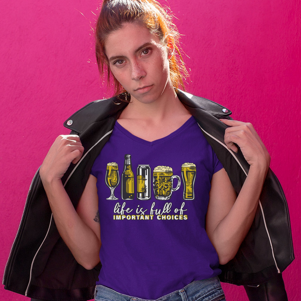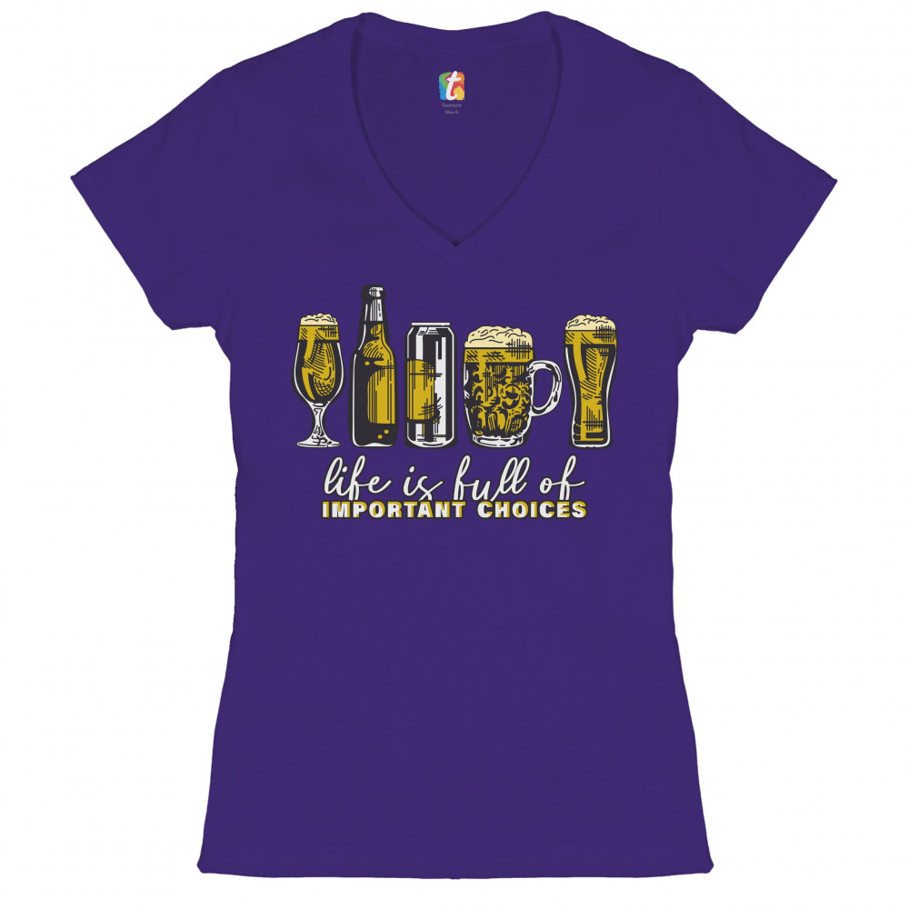 LIFE IS FULL OF IMPORTANT CHOICES women's v-neck t-shirt beer drinking ipa tee purple