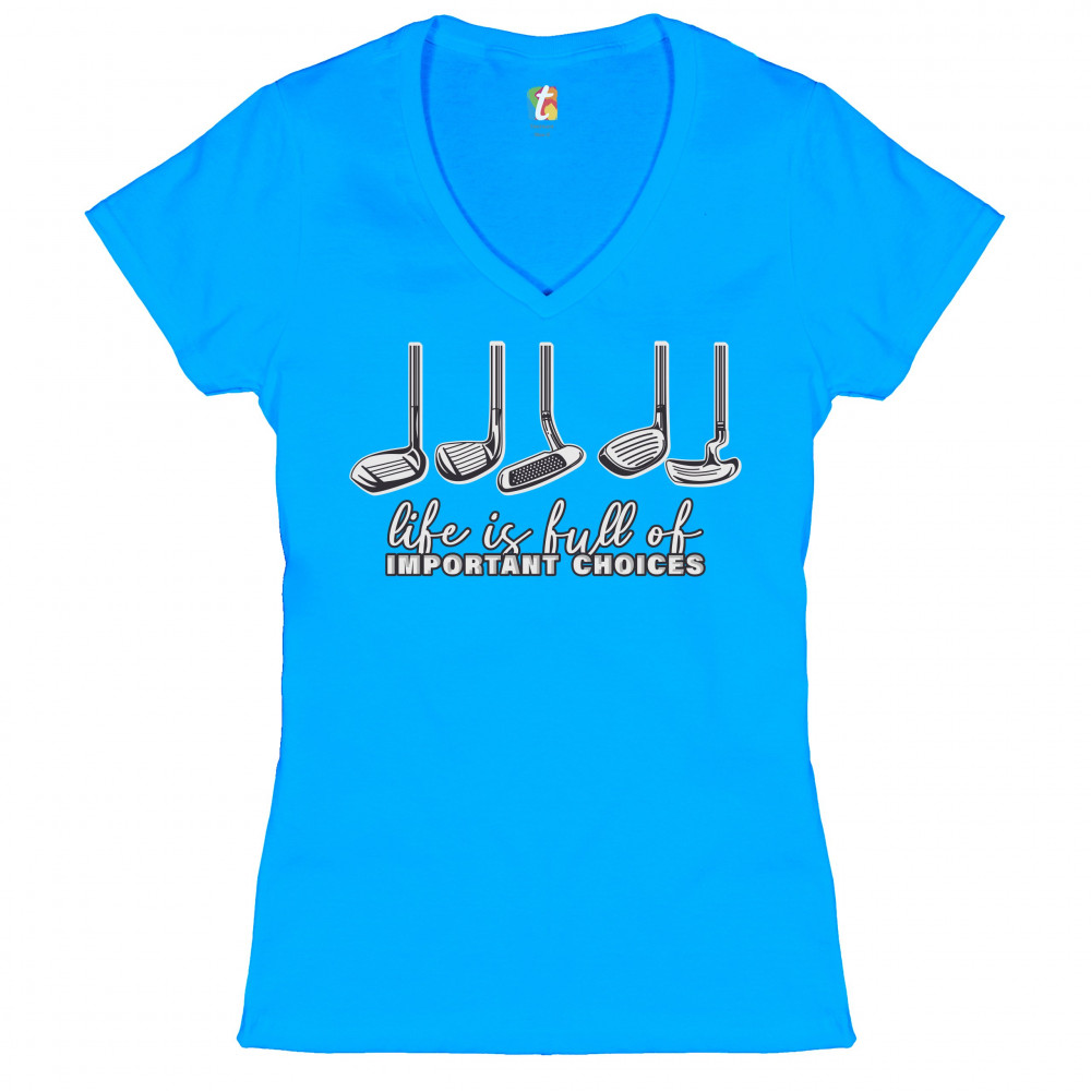 LIFE IS FULL OF IMPORTANT CHOICES women's v-neck t-shirt funny golf clubs tee turquoise