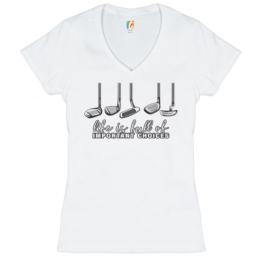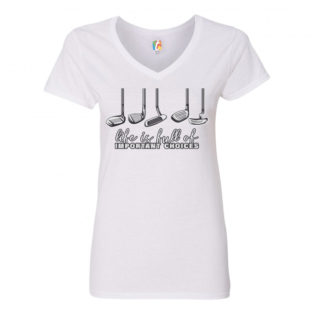 LIFE IS FULL OF IMPORTANT CHOICES women's v-neck t-shirt funny golf clubs tee white