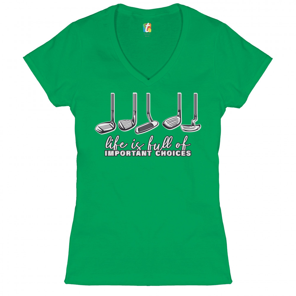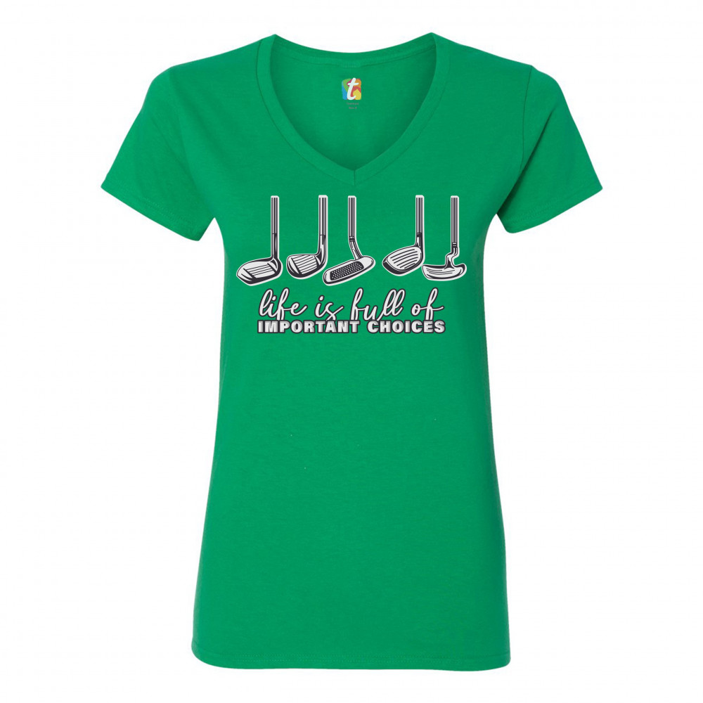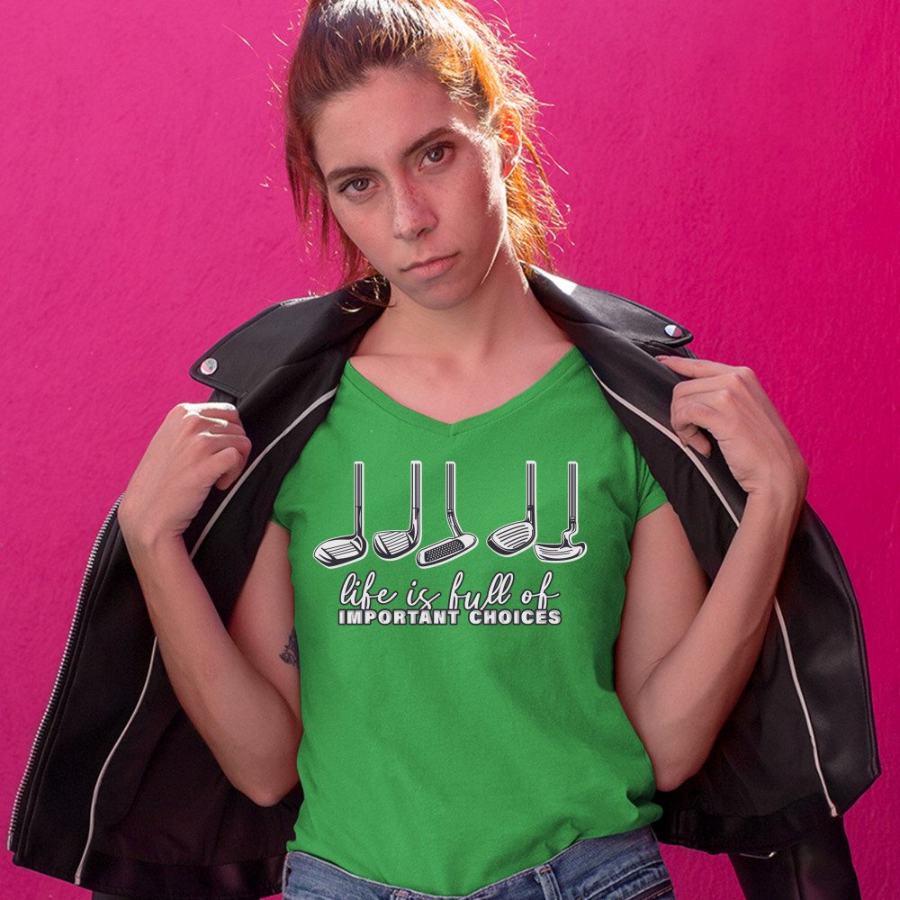 LIFE IS FULL OF IMPORTANT CHOICES women's v-neck t-shirt funny golf clubs tee green