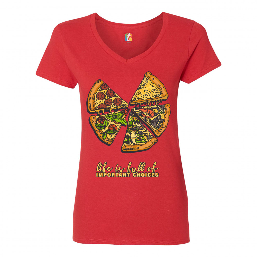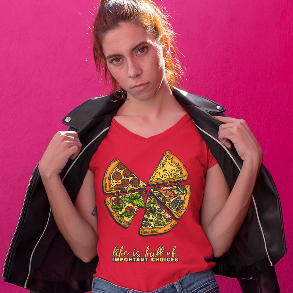 LIFE IS FULL OF IMPORTANT CHOICES women's v-neck t-shirt pepperoni pizza tee red