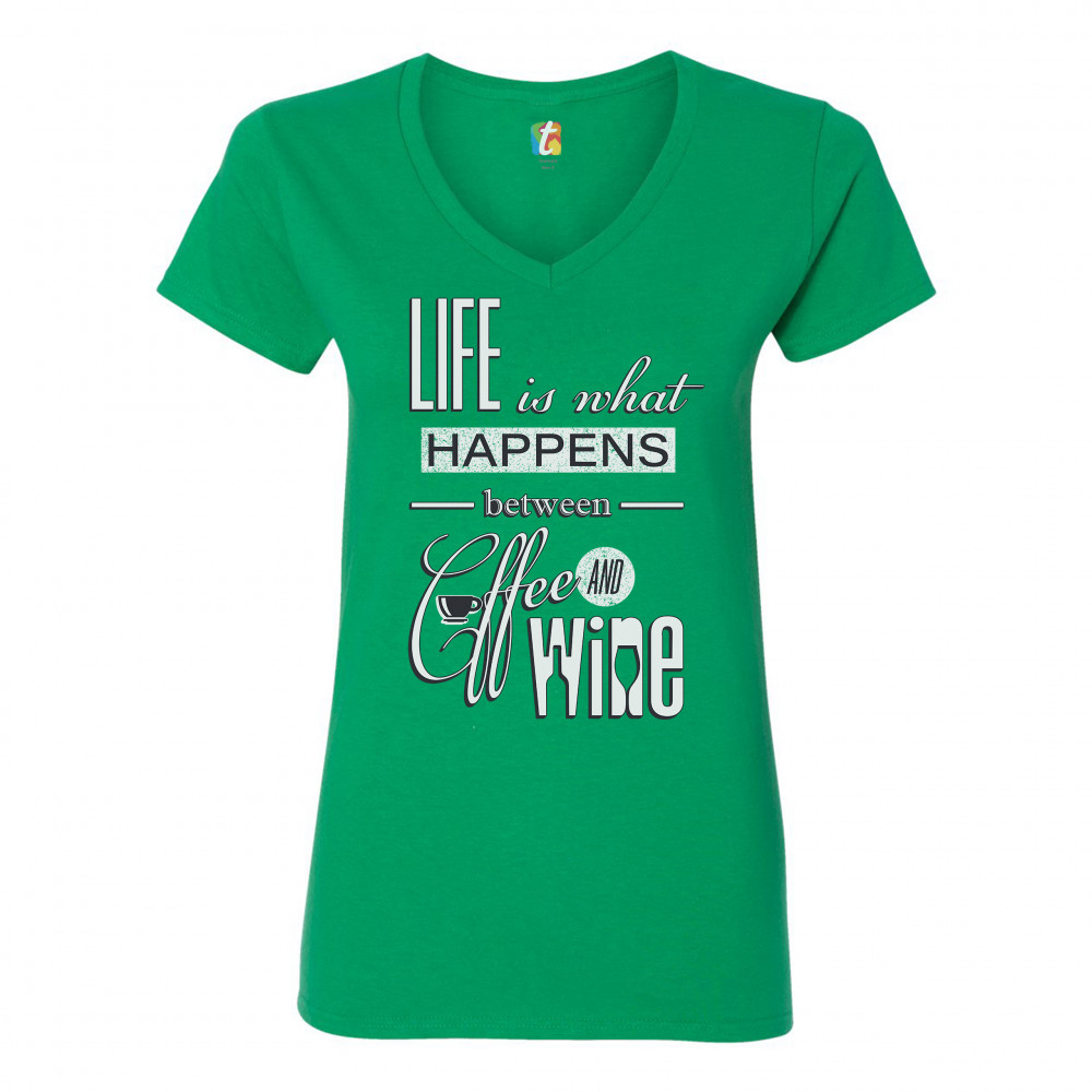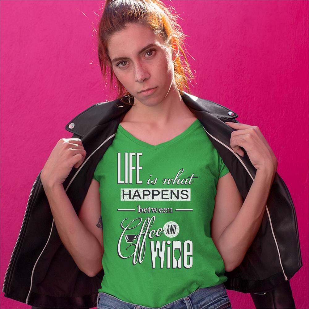 A print saying "Life is what happens between coffee and wine". Inside the letter "C" in "coffee" there is a cup and inside the word "wine" there are silhouettes of a bottle and a glass. Wear it to spread positive vibes and show your passion for the two best drinks in the universe!