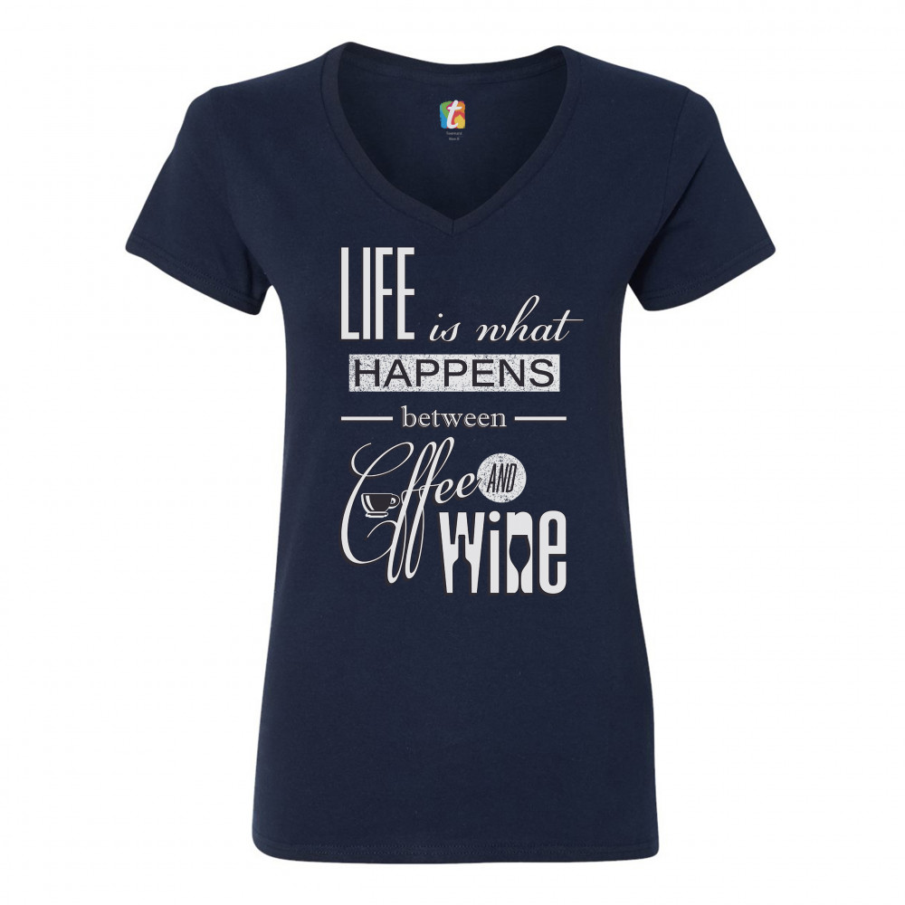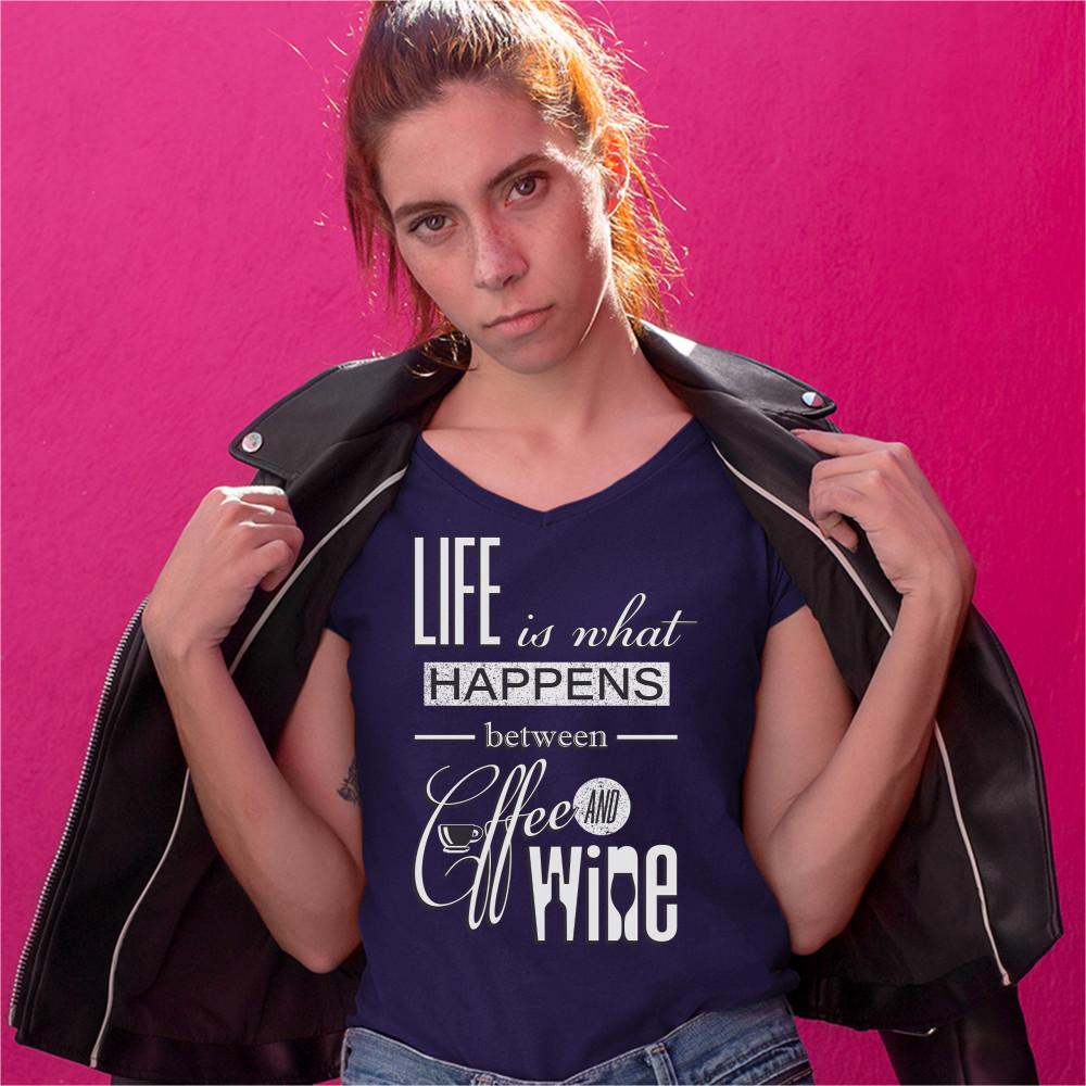 A print saying "Life is what happens between coffee and wine". Inside the letter "C" in "coffee" there is a cup and inside the word "wine" there are silhouettes of a bottle and a glass. Wear it to spread positive vibes and show your passion for the two best drinks in the universe!