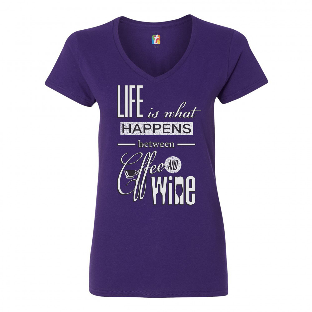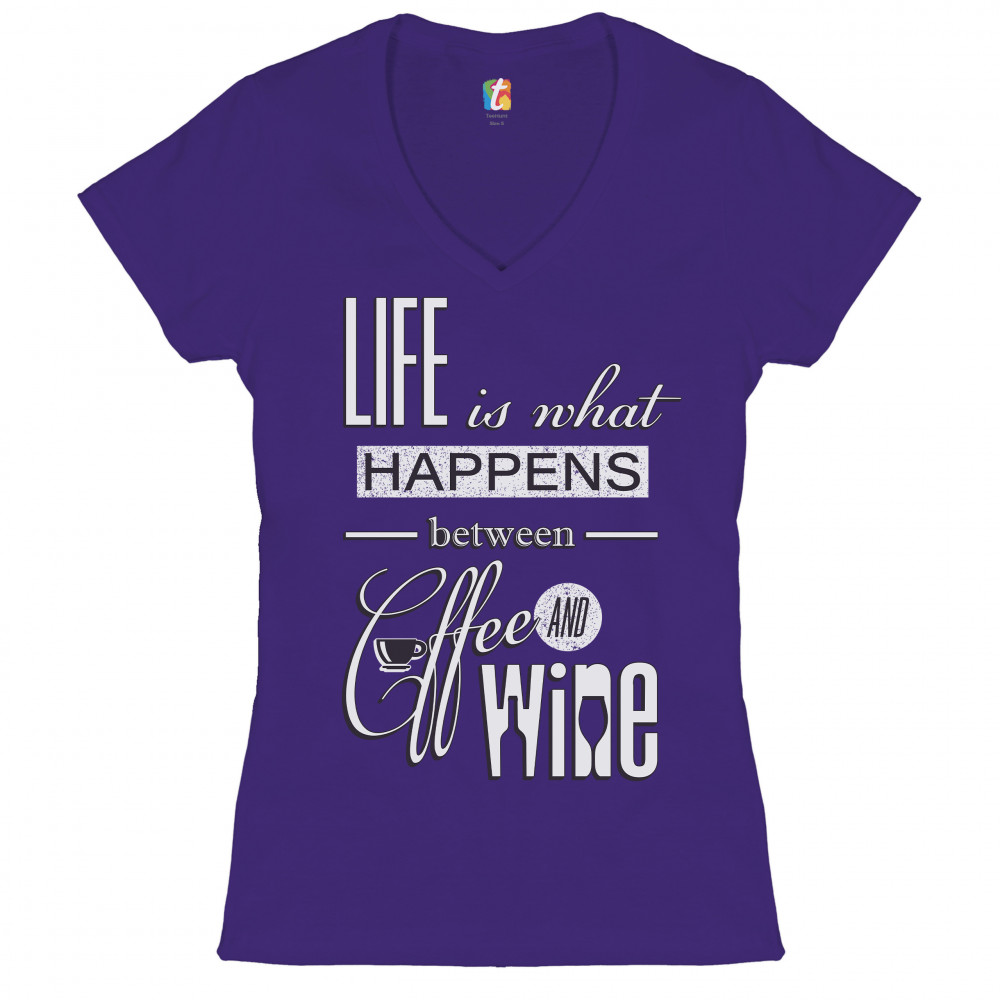 A print saying "Life is what happens between coffee and wine". Inside the letter "C" in "coffee" there is a cup and inside the word "wine" there are silhouettes of a bottle and a glass. Wear it to spread positive vibes and show your passion for the two best drinks in the universe!