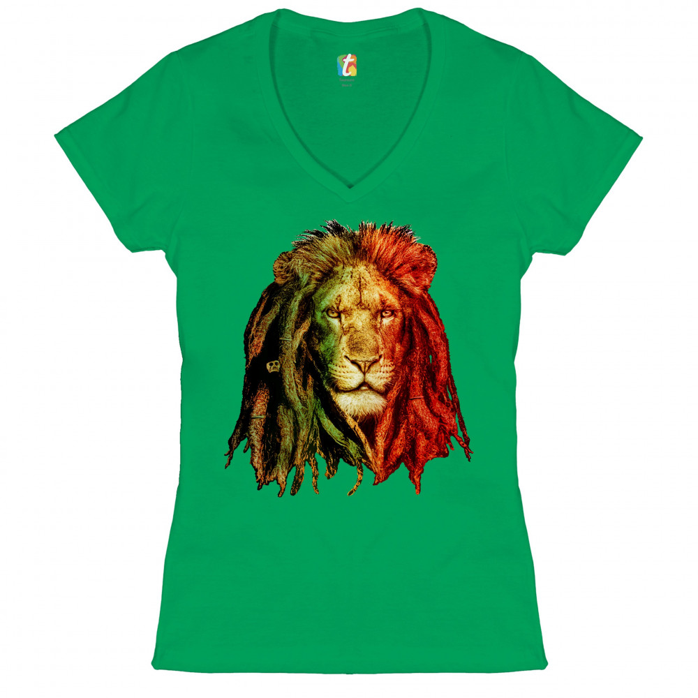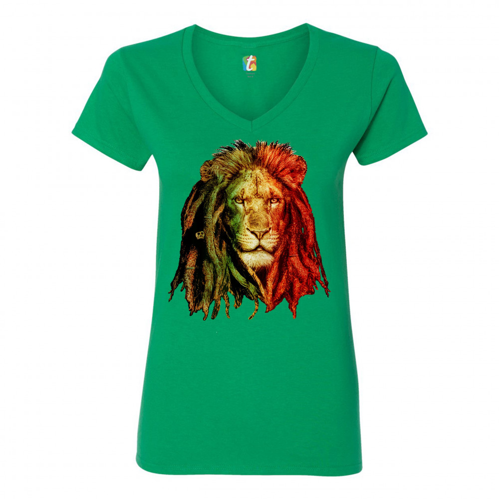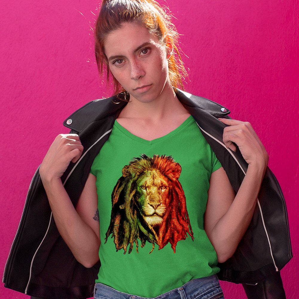 LION WITH DREADLOCKS women's v-neck t-shirt jah jamaica marijuana 420 tee green