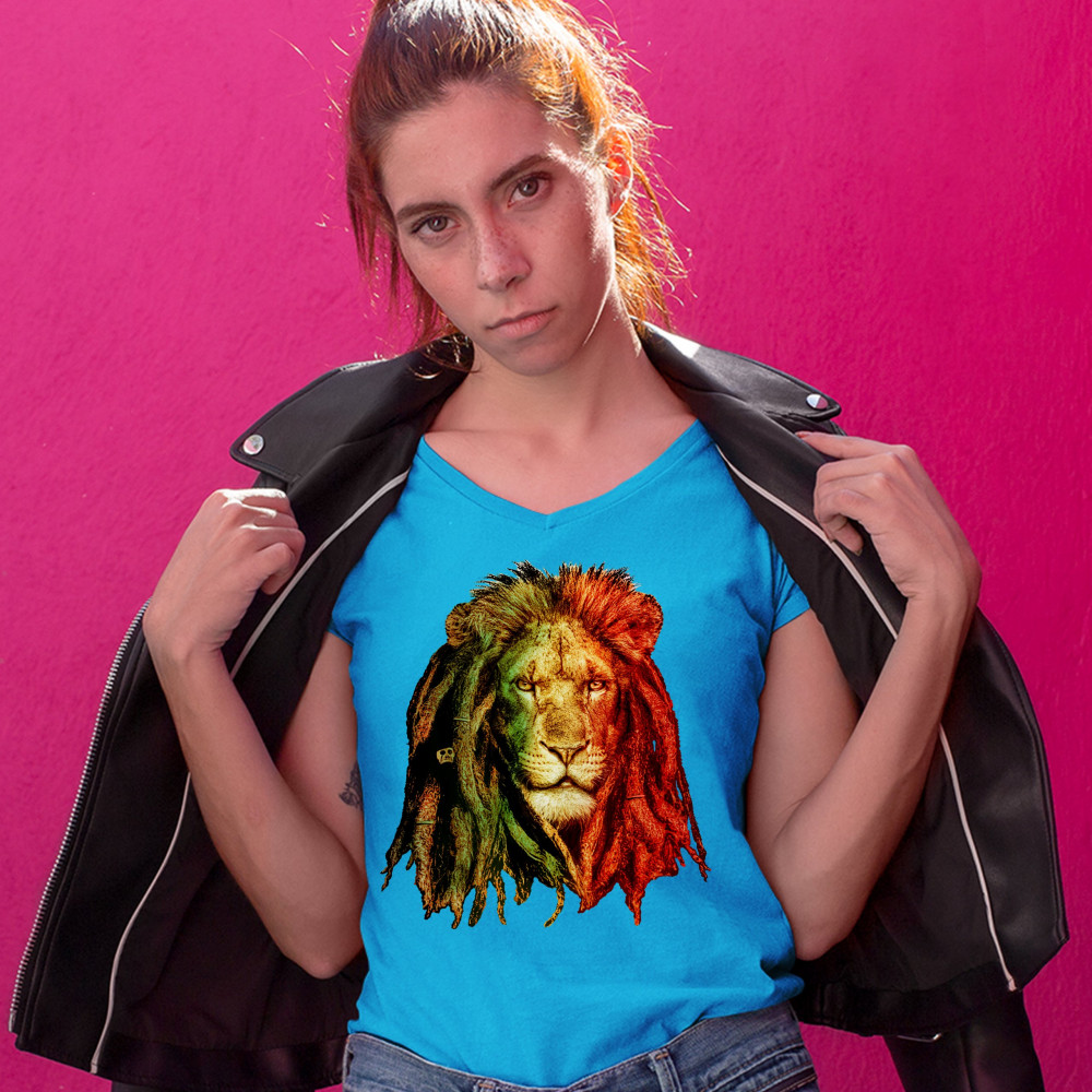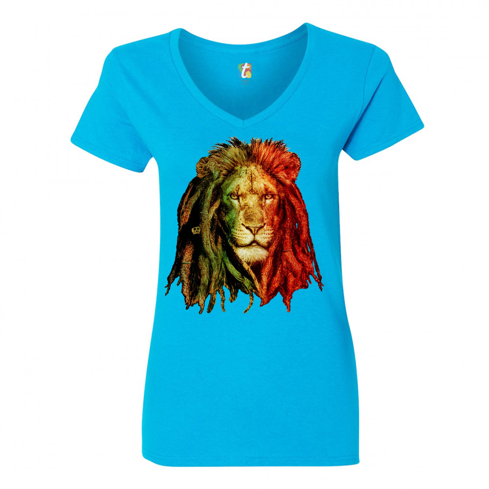 LION WITH DREADLOCKS women's v-neck t-shirt jah jamaica marijuana 420 tee turquoise