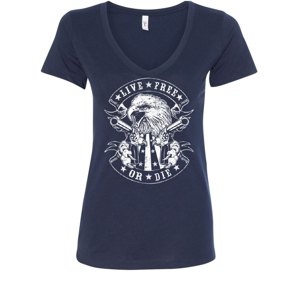 LIVE FREE OR DIE women's v-neck t-shirt eagle biker 2nd amendment american flag navy blue