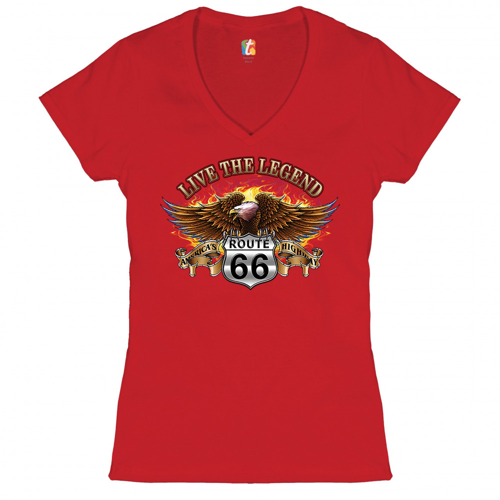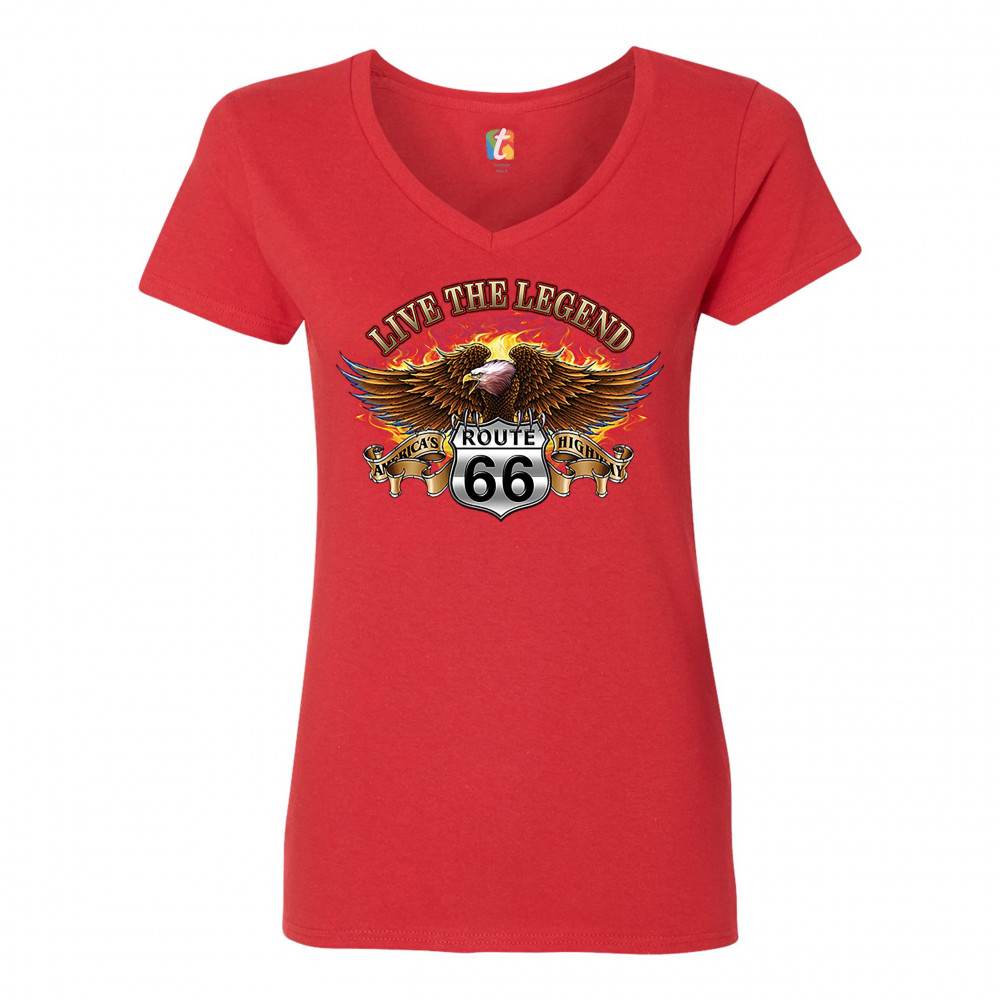 LIVE THE LEGEND AMERICA'S HIGHWAYS women's v-neck t-shirt route 66 biker tee red