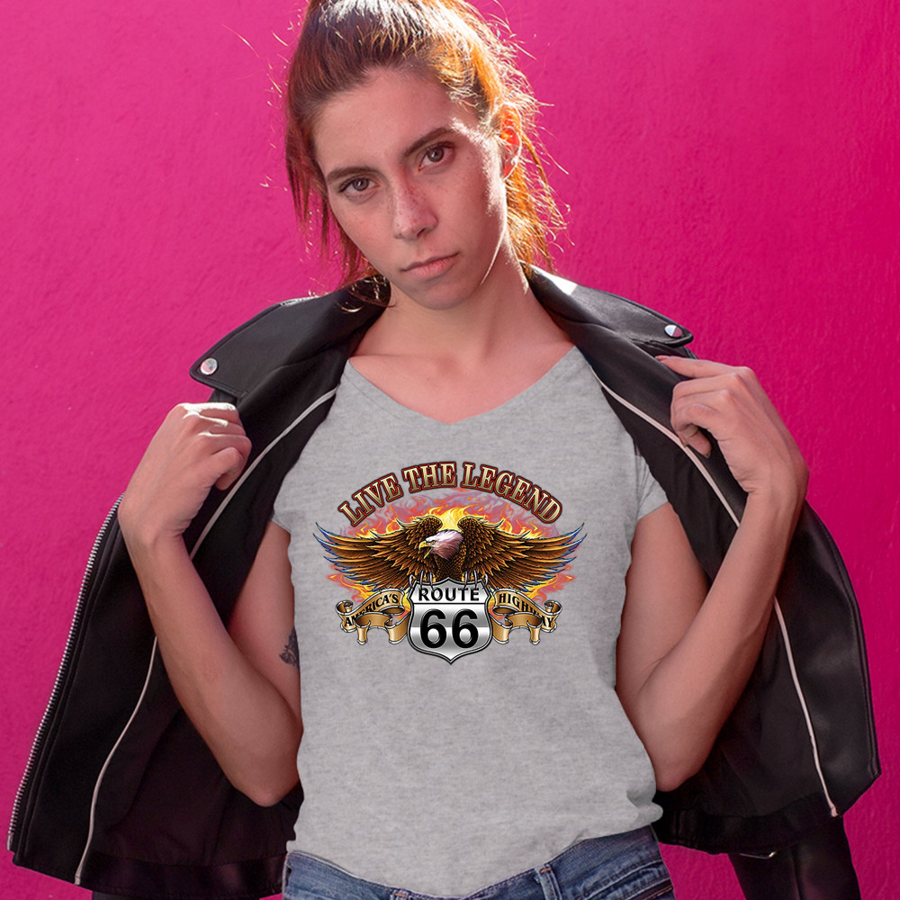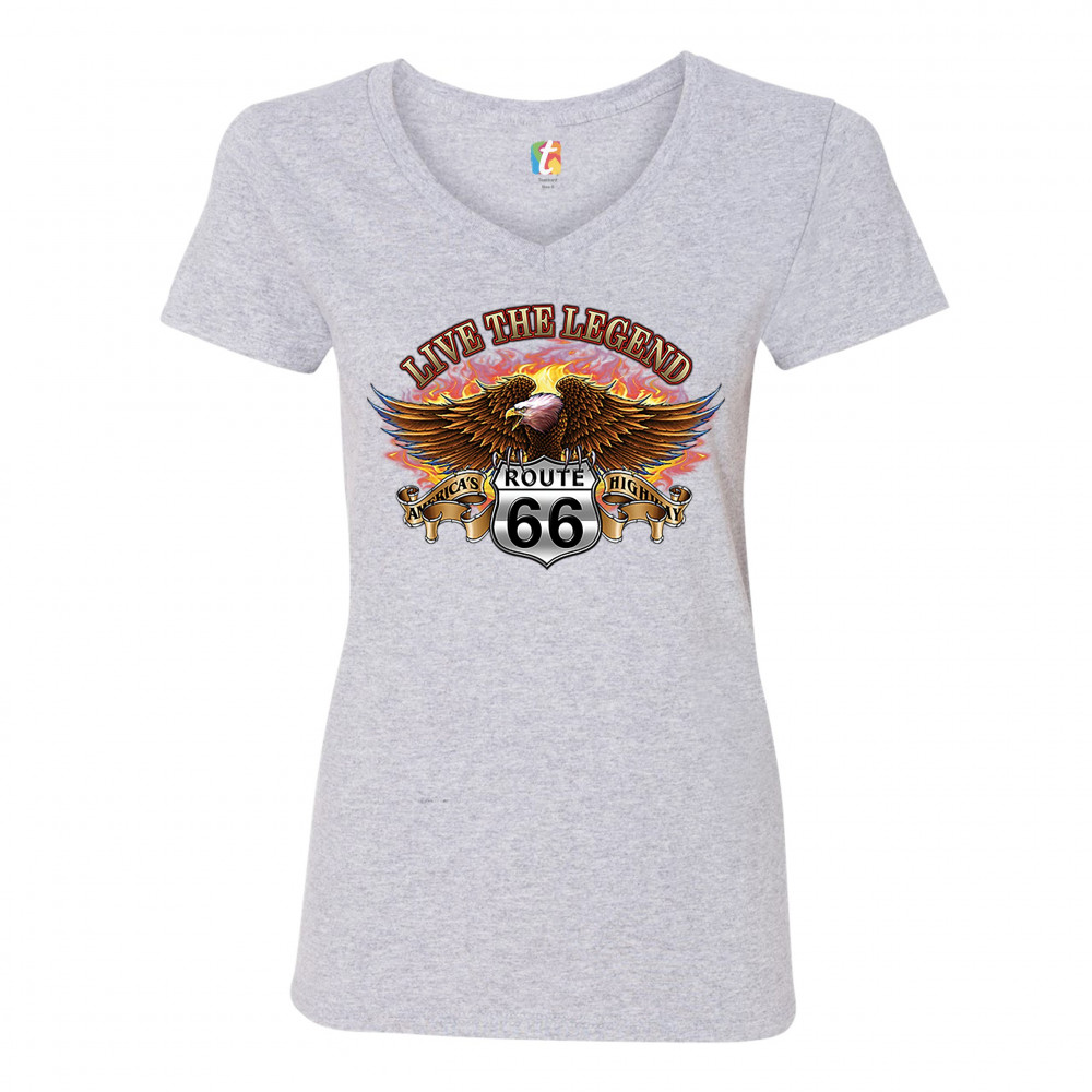 LIVE THE LEGEND AMERICA'S HIGHWAYS women's v-neck t-shirt route 66 biker tee gray
