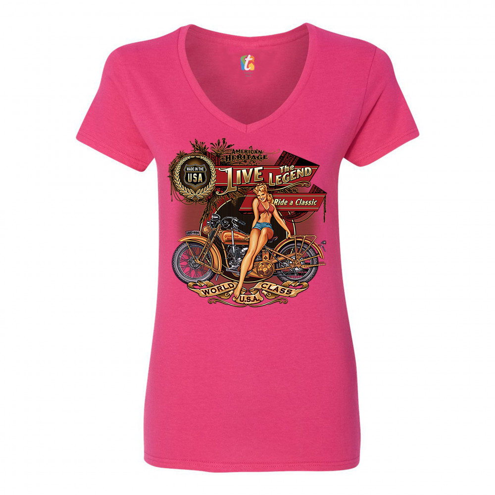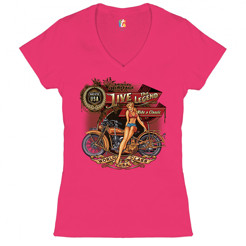 A print featuring a vintage motorcycle with a sexy girl sitting on top of it. On multiple stripes or signs the print says: "American Heritage, Made in the USA, Live the Legend, Ride a Classic, Live to Ride, World Class U.S.A." A great choice for a motorcy