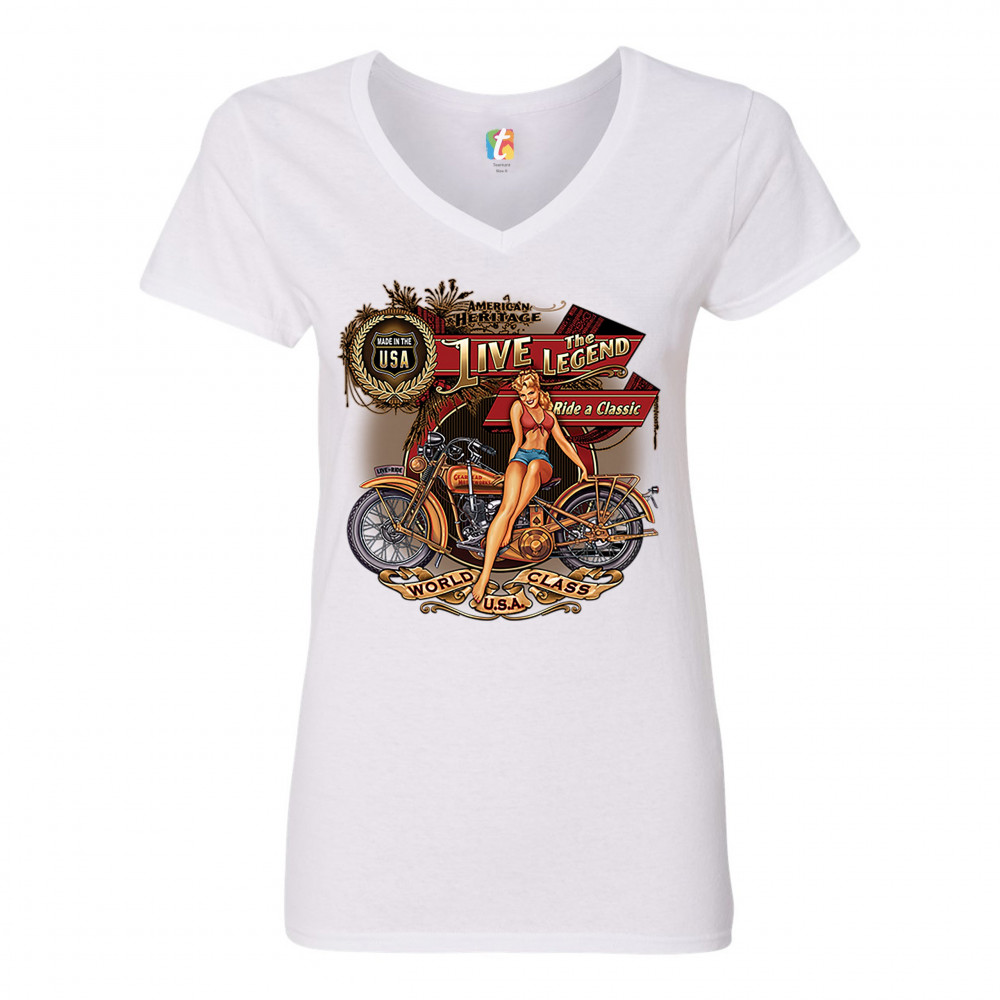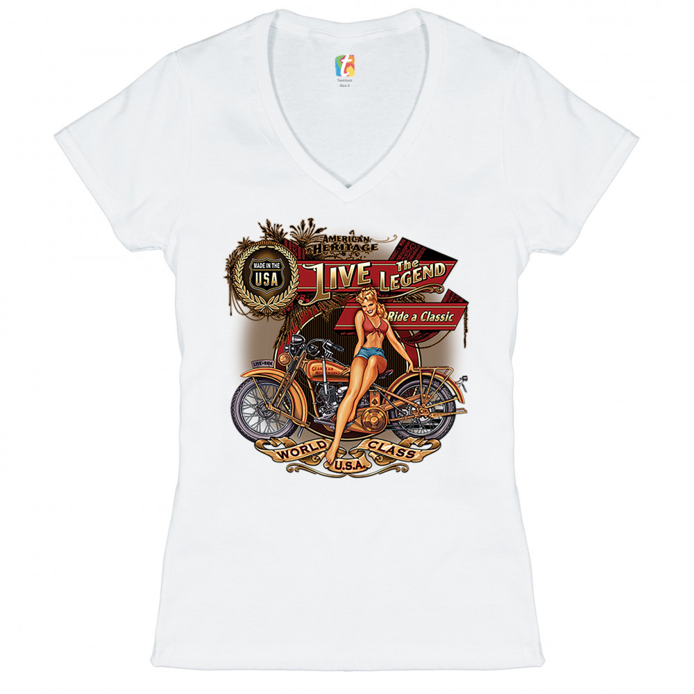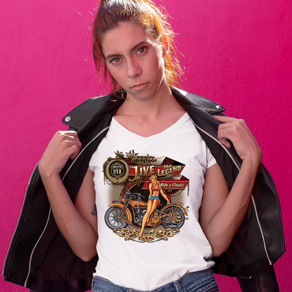 A print featuring a vintage motorcycle with a sexy girl sitting on top of it. On multiple stripes or signs the print says: "American Heritage, Made in the USA, Live the Legend, Ride a Classic, Live to Ride, World Class U.S.A." A great choice for a motorcy