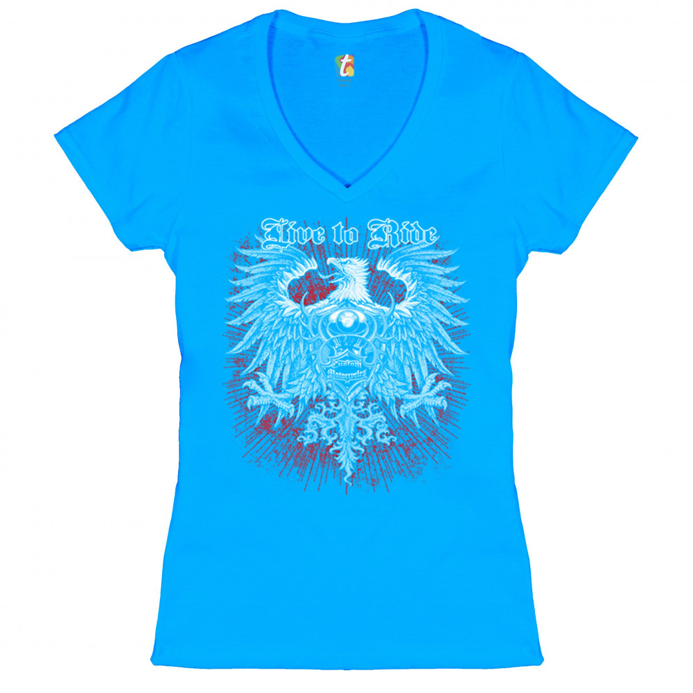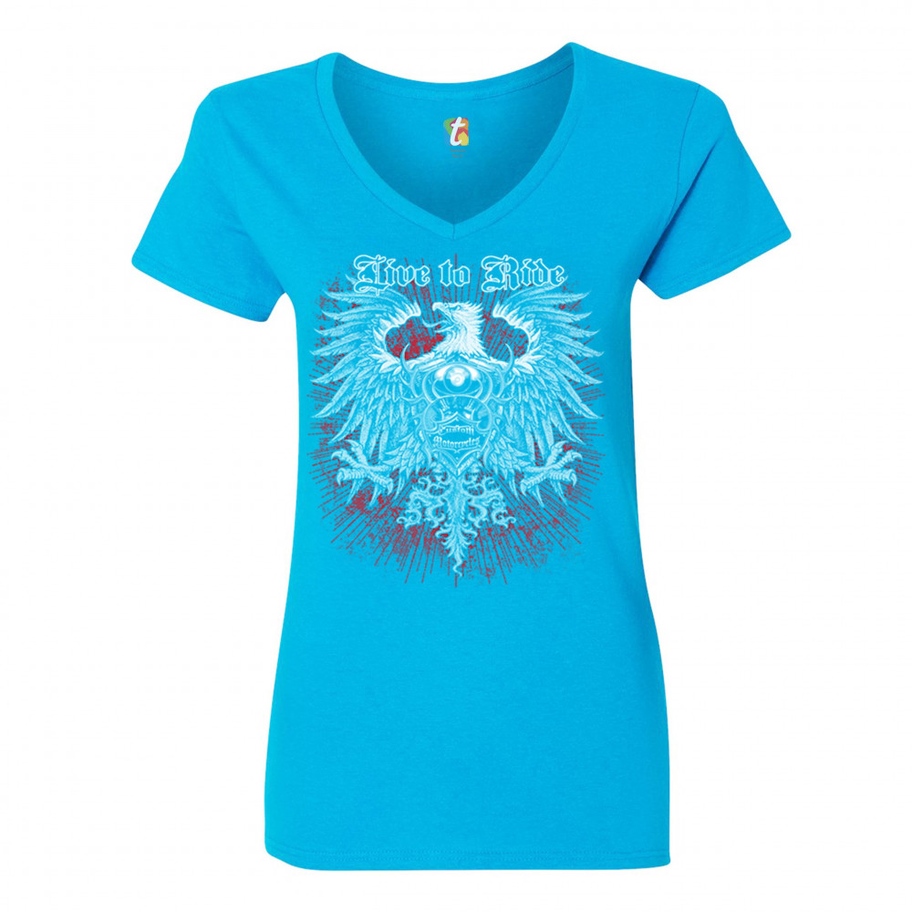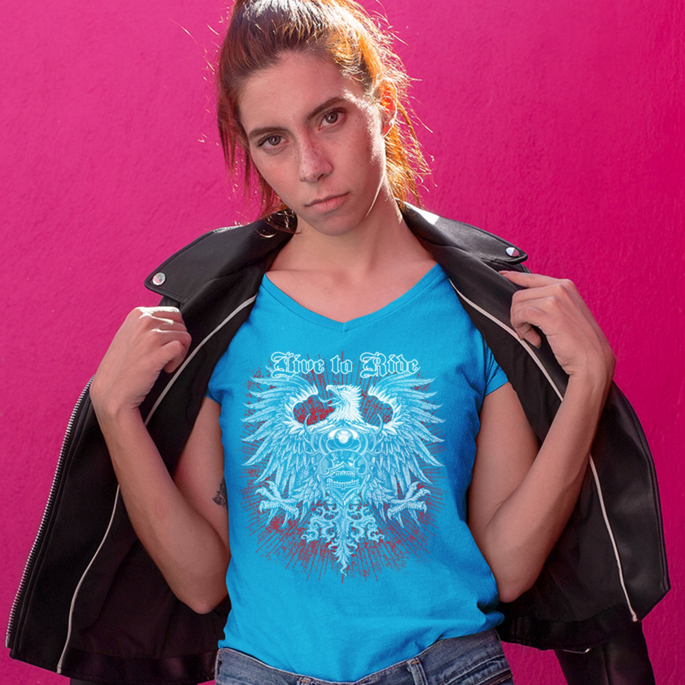 LIVE TO RIDE women's v-neck t-shirt custom motorcycles mc biker gang eagle tee turquoise