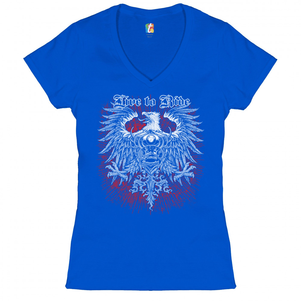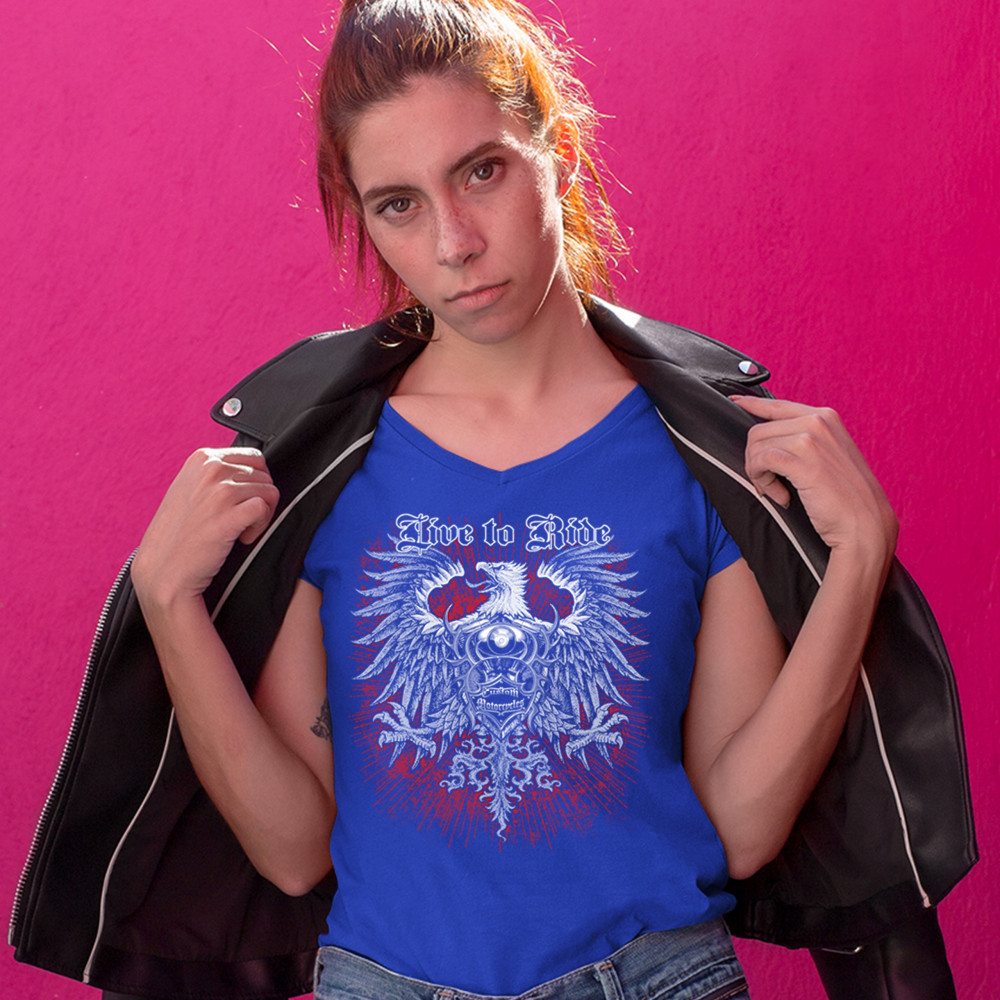 LIVE TO RIDE women's v-neck t-shirt custom motorcycles mc biker gang eagle tee royal blue