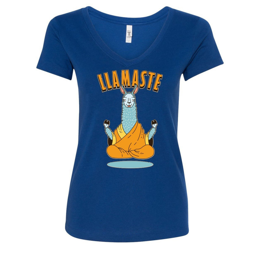 LLAMASTE women's v-neck t-shirt funny yoga namaste llama peace pilates lotus om royal blue