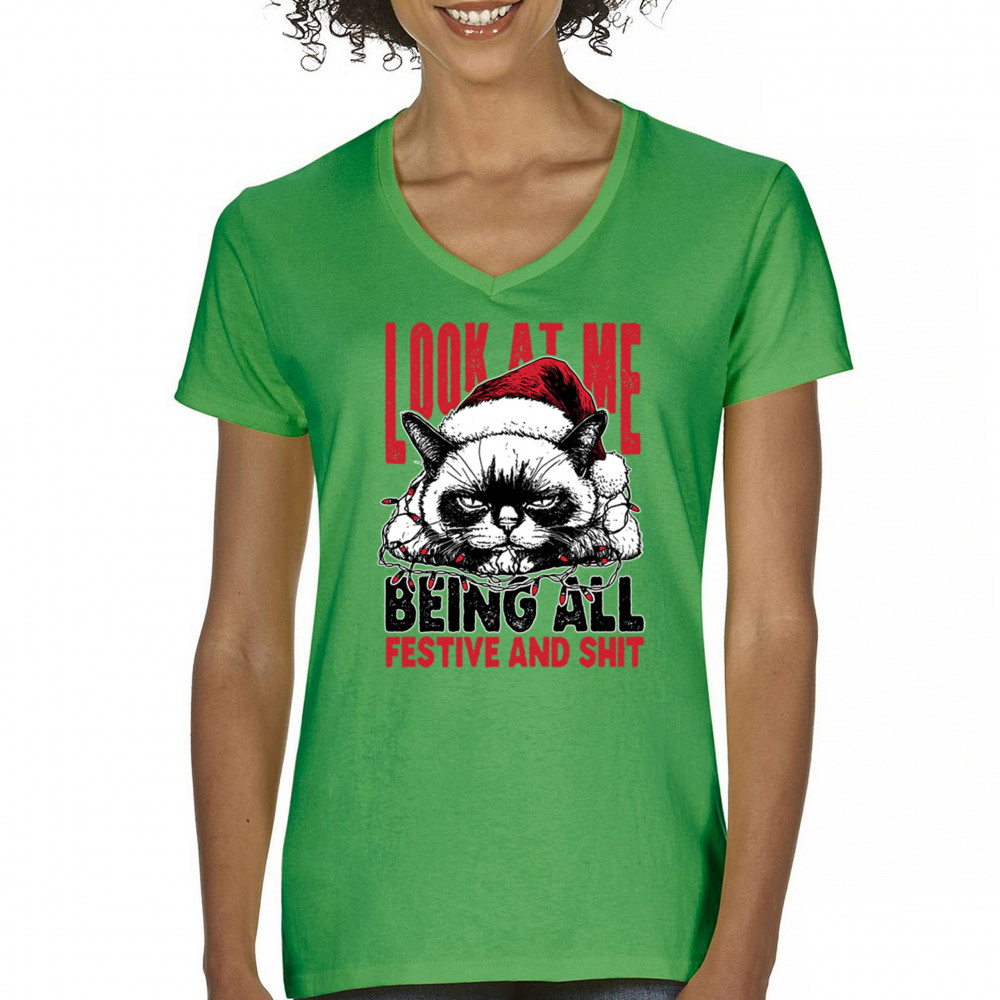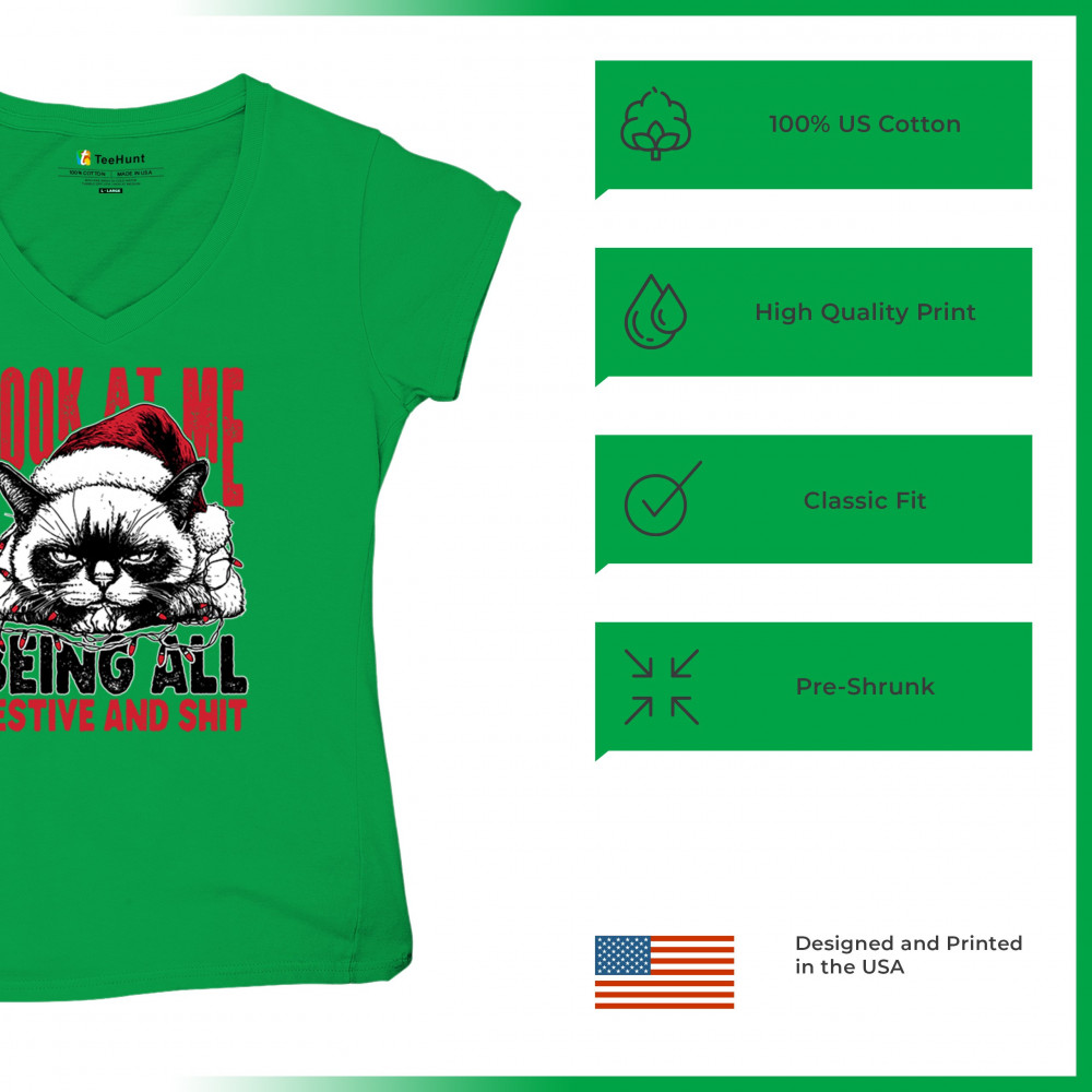 Grumpy Cat Christmas design with Santa hat, Christmas tree humor, Let It Snow vibes, Jingle Bells style, and sarcastic Merry Xmas spirit.