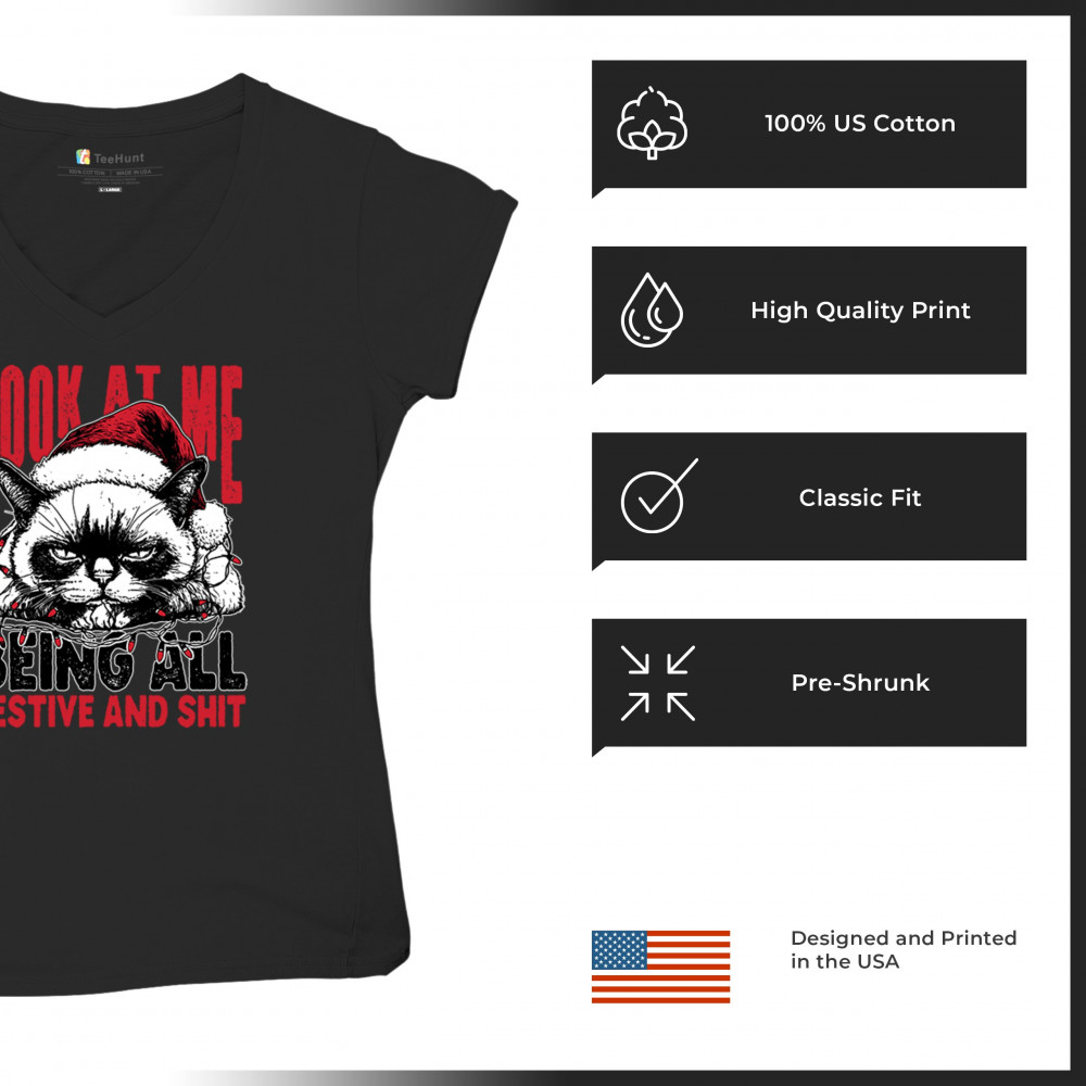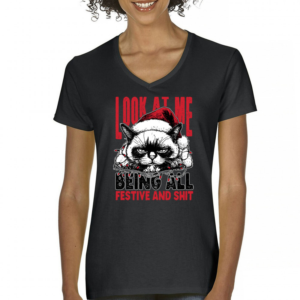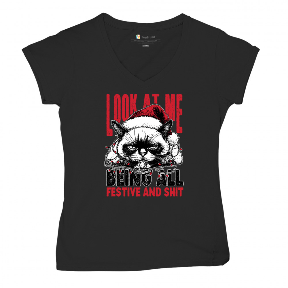 Grumpy Cat Christmas design with Santa hat, Christmas tree humor, Let It Snow vibes, Jingle Bells style, and sarcastic Merry Xmas spirit.