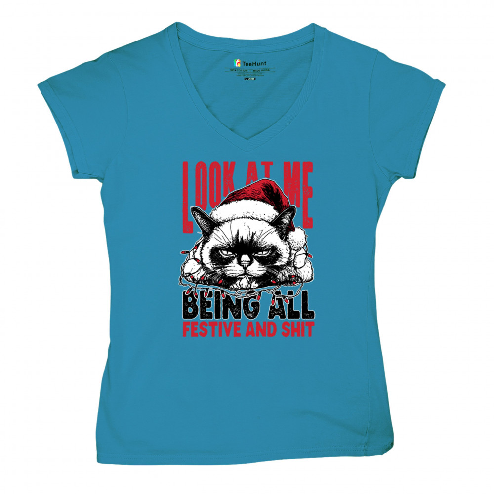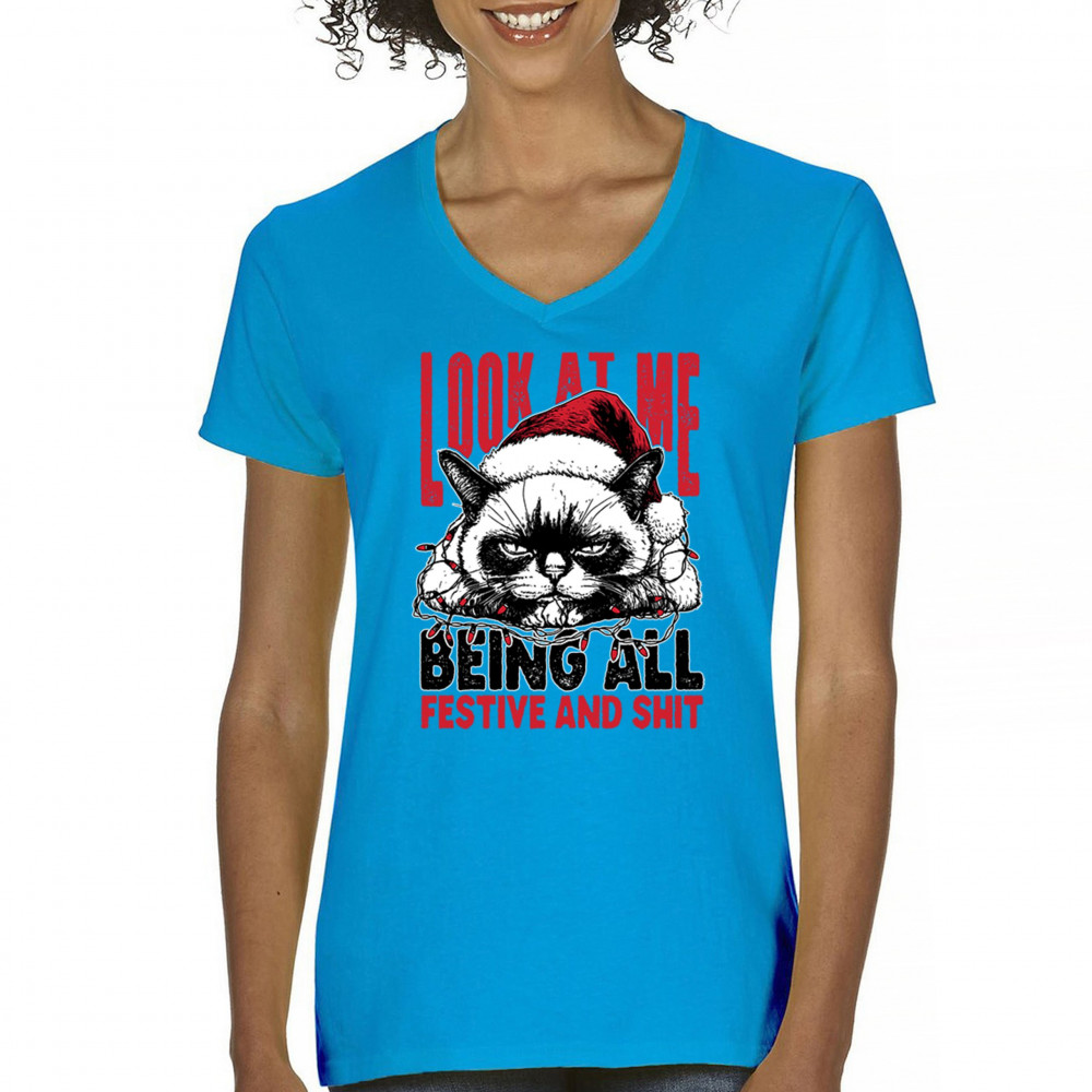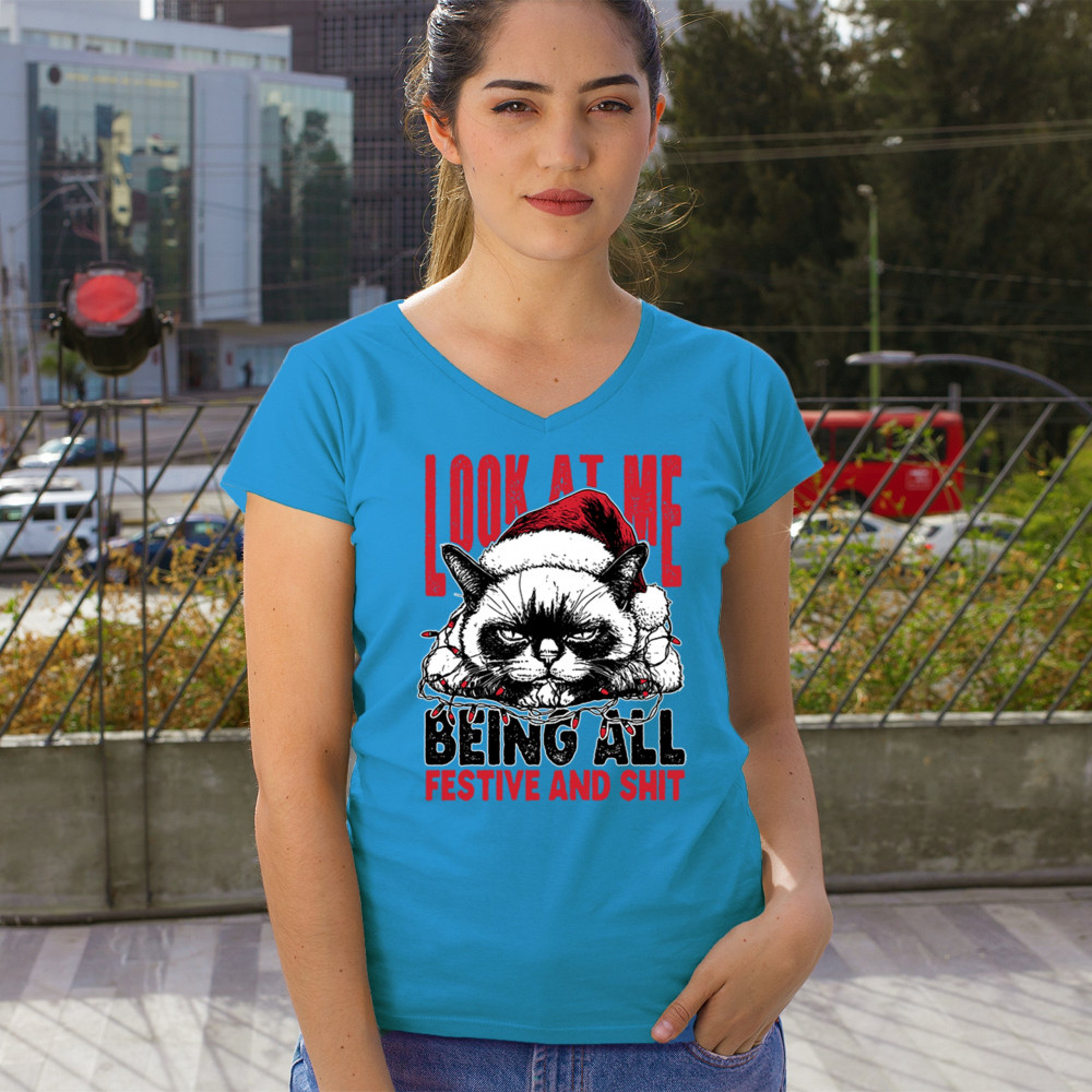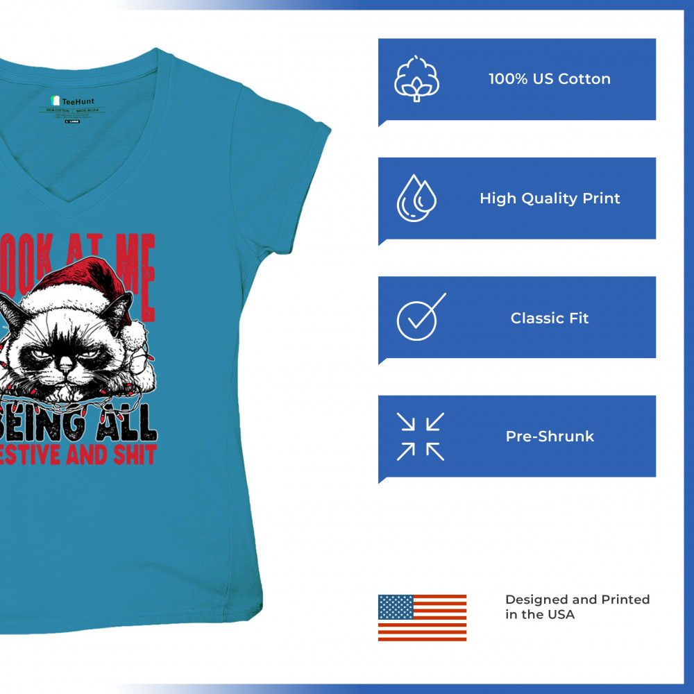 Grumpy Cat Christmas design with Santa hat, Christmas tree humor, Let It Snow vibes, Jingle Bells style, and sarcastic Merry Xmas spirit.
