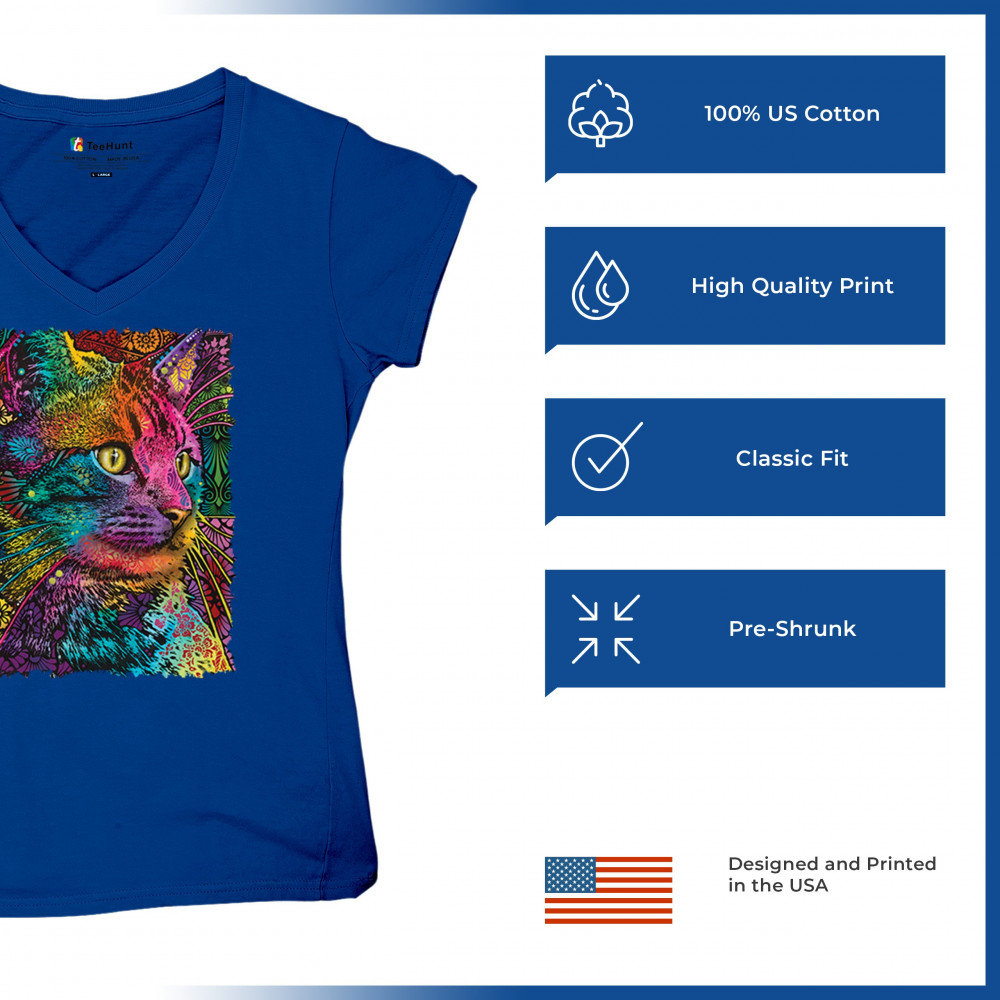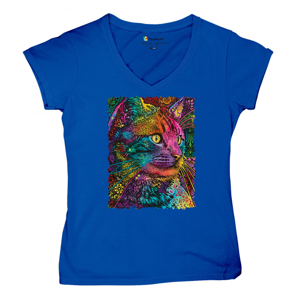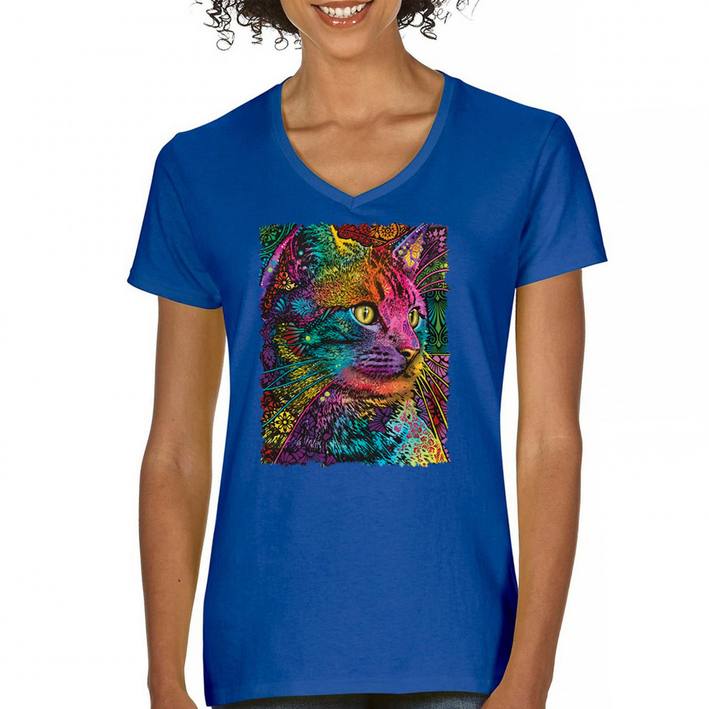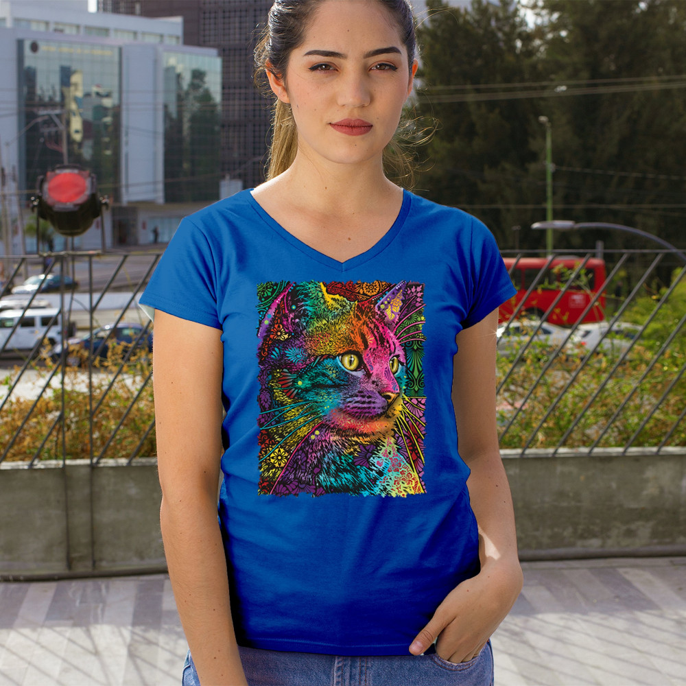LOVABLE CAT women's v-neck t-shirt dean russo colorful felis catus tee royal blue