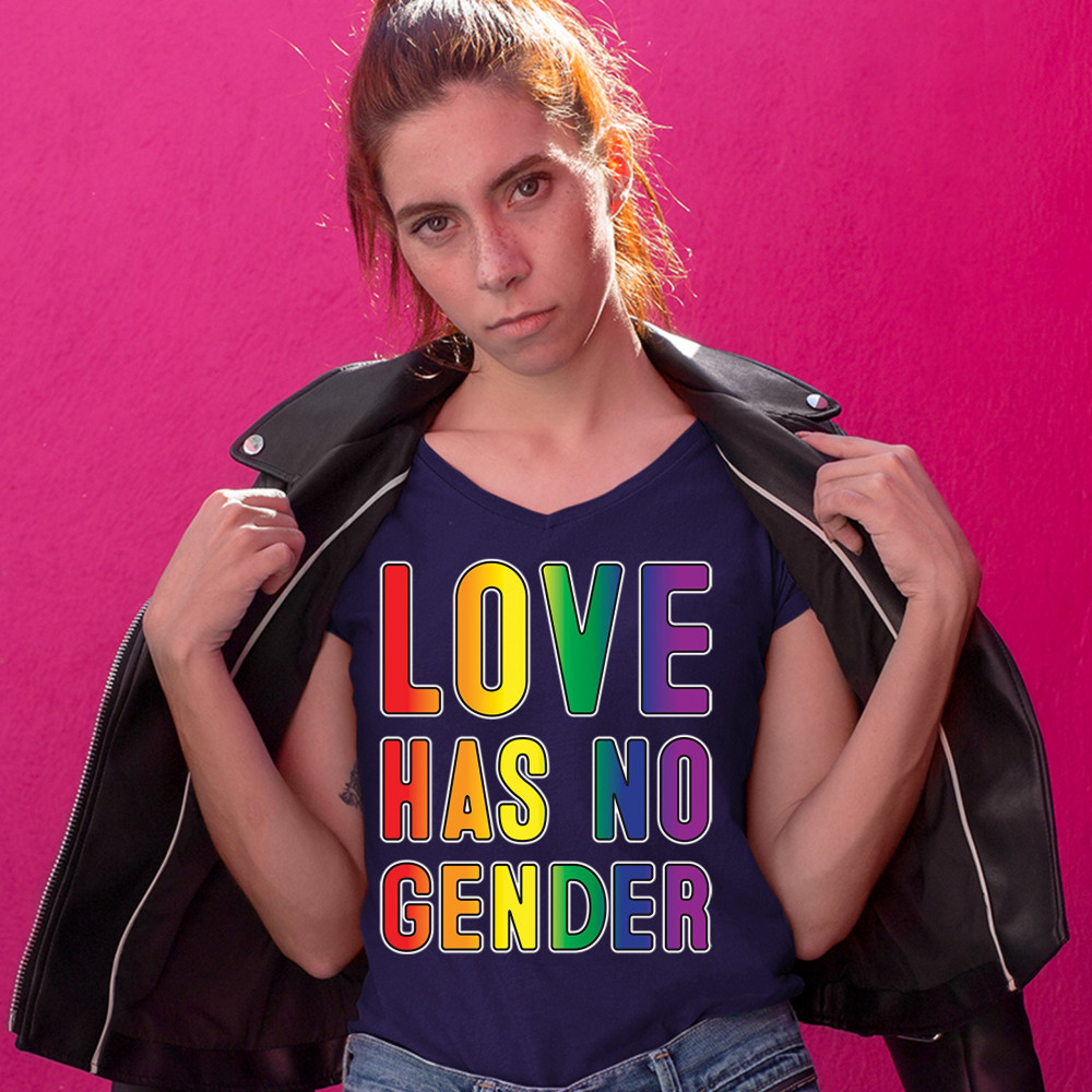 A print featuring a phrase: "Love Has No Gender" painted in rainbow colors. Great choice to wear as a proud queer person.
