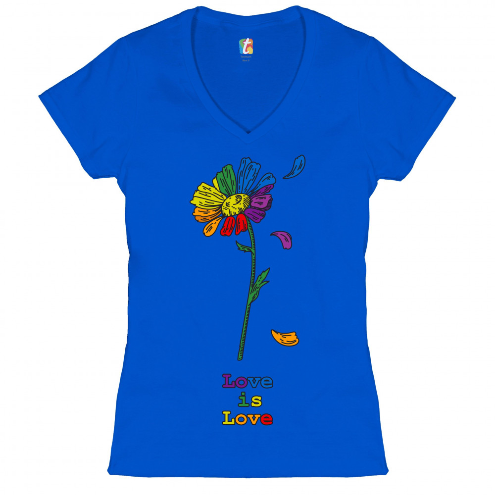 LOVE IS LOVE women's v-neck t-shirt rainbow flower lgbt queer acceptance tee royal blue
