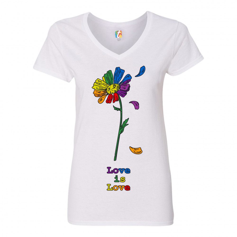 LOVE IS LOVE women's v-neck t-shirt rainbow flower lgbt queer acceptance tee white