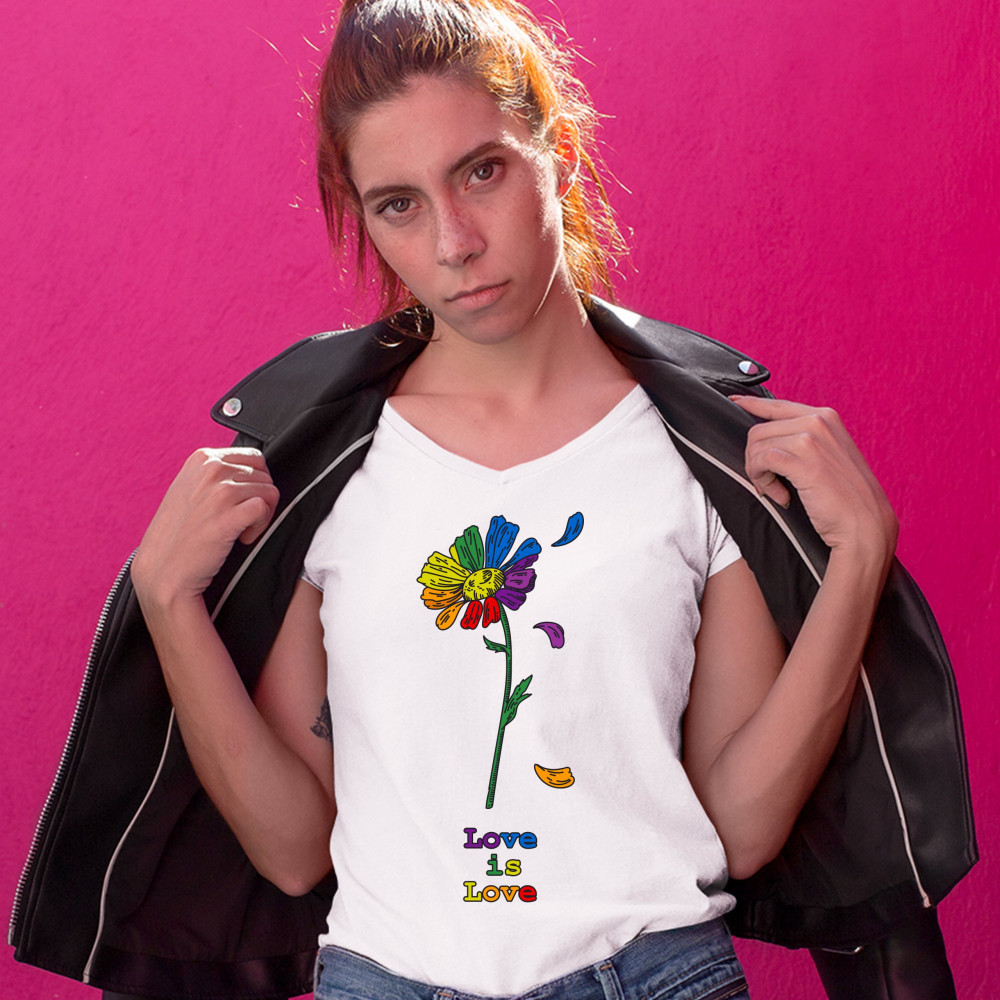 A print featuring a flower with leaves, painted in rainbow colors, falling off it. Below it it says: "Love Is Love". Great choice to wear as a proud queer person.