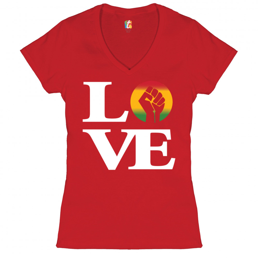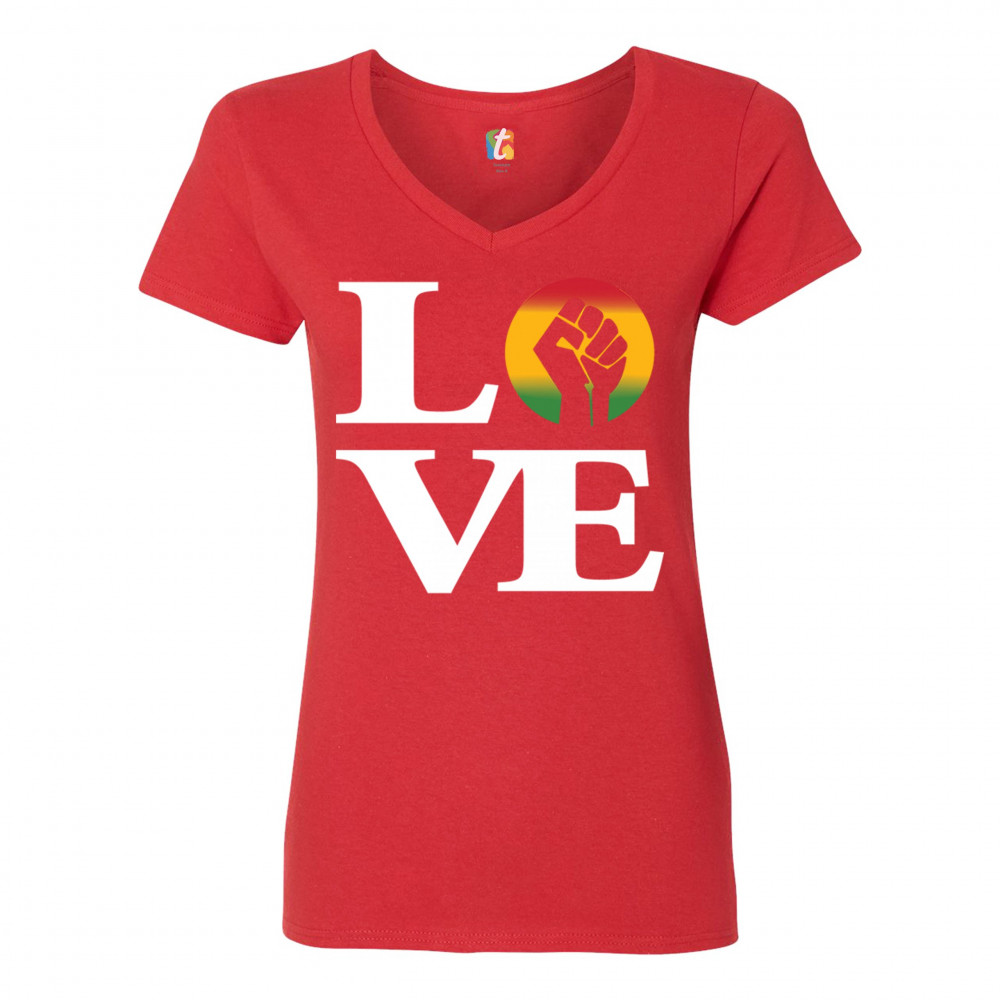 LOVE POWER FIST women's v-neck t-shirt black lives matter african american tee red