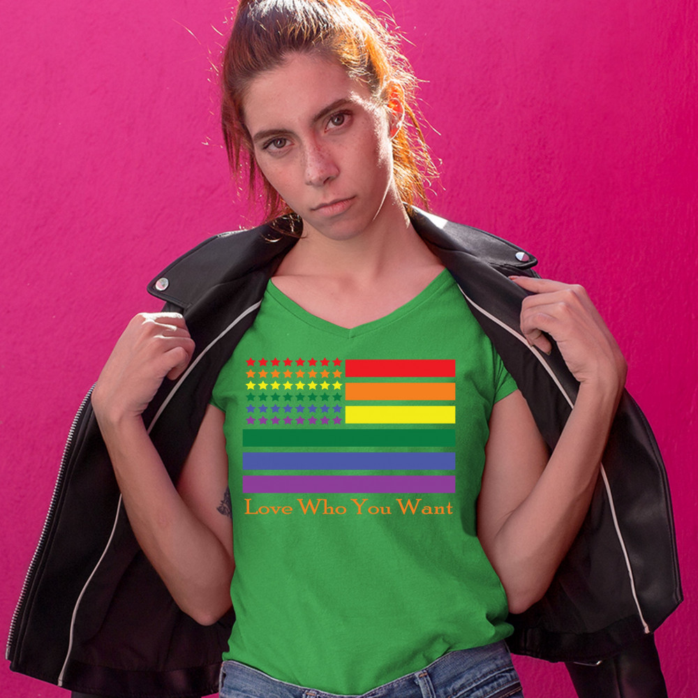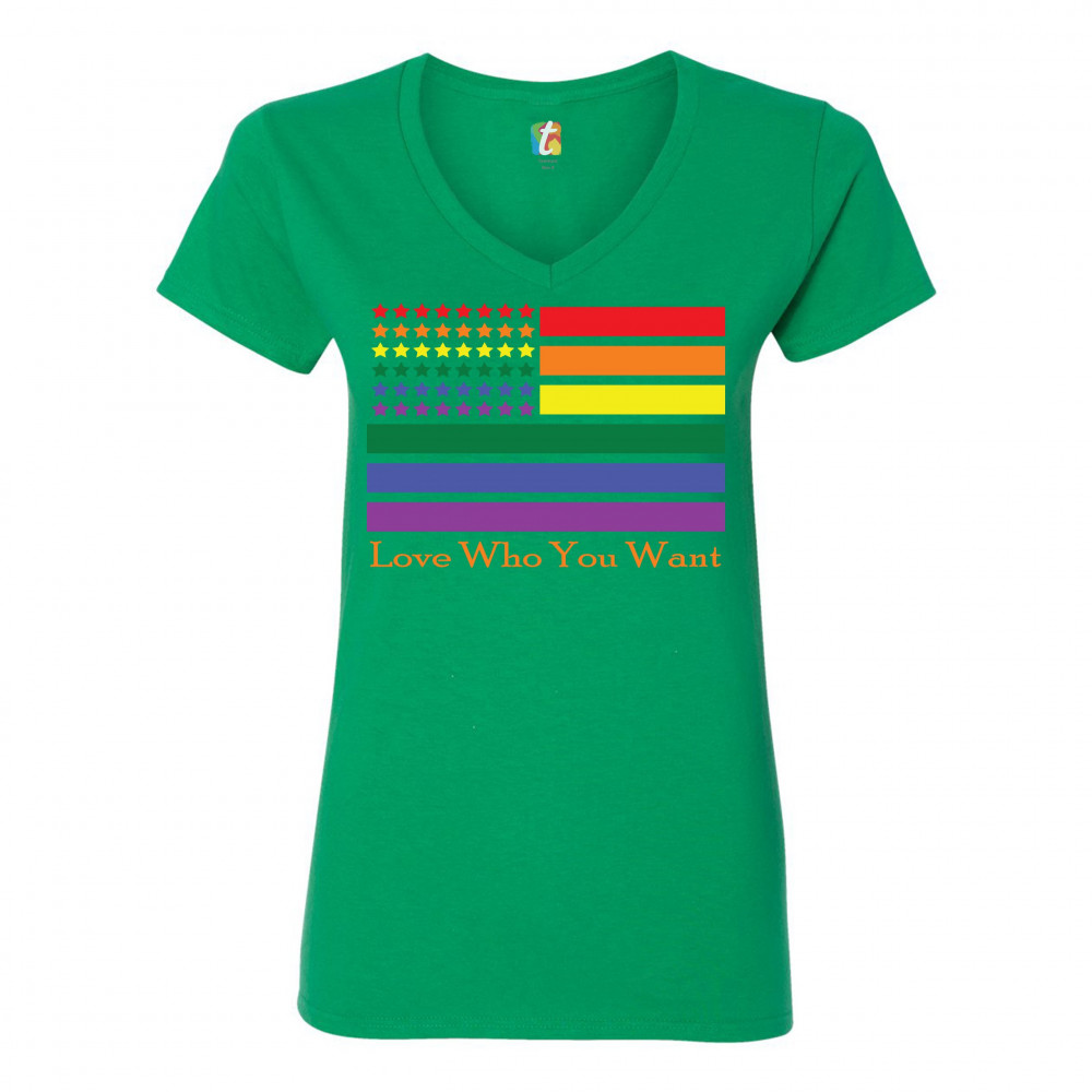 LOVE WHO YOU WANT women's v-neck t-shirt american gay pride rainbow flag tee green
