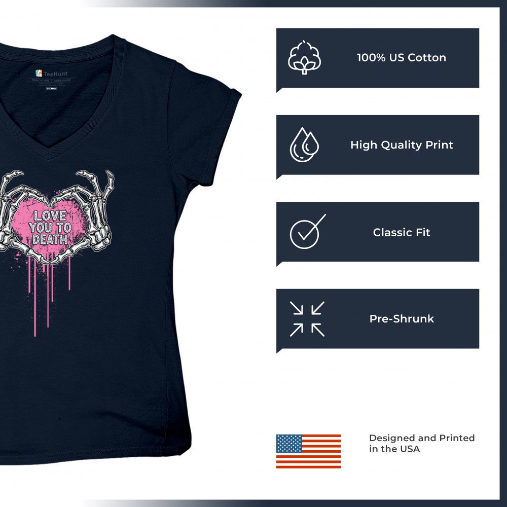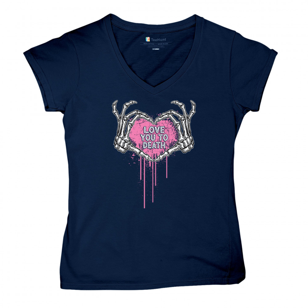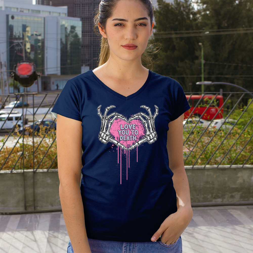 Show your spooky side with this skeleton hands heart design featuring a pink background and the phrase "Love You to Death." A perfect piece for alternative couples, Halloween lovers, and romantic rebels who embrace both affection and dark humor. Great for spooky season, date nights, and alt fashion outfits.