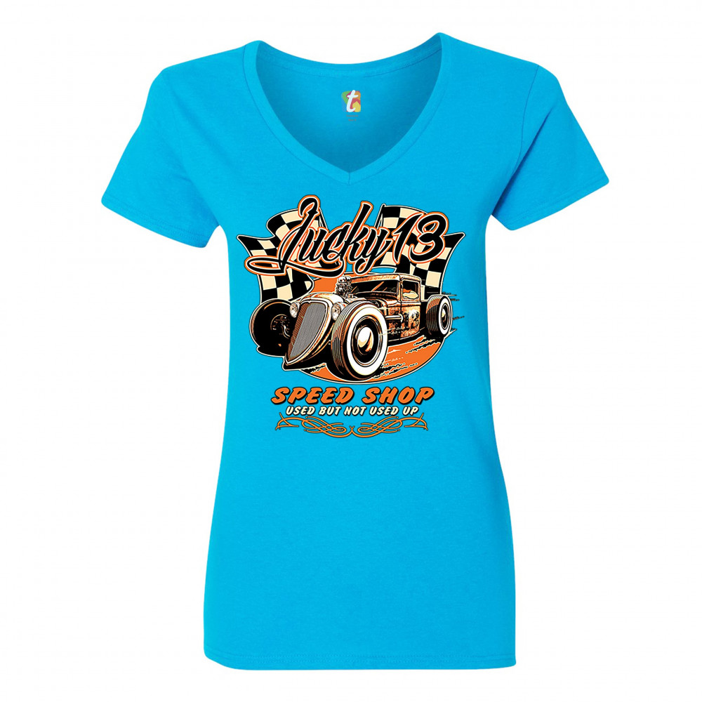 LUCKY 13 SPEED SHOP women's v-neck t-shirt rat rod route 66 racing car tee turquoise