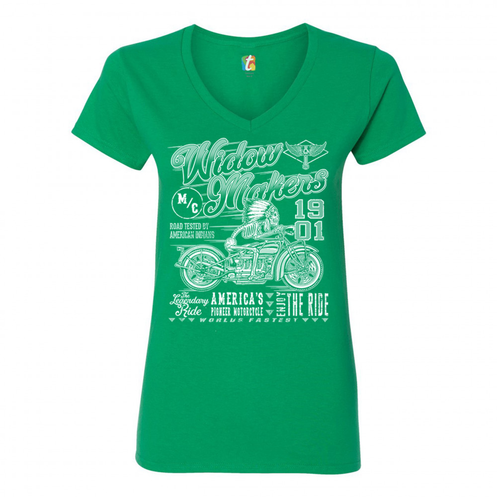 A print featuring a skeleton wearing a native American warbonnet and riding a bobber motorcycle. There is also a logo with a winged piston in the top right corner. The print says: "M/C Widowmakers 1901, road tested by American Indians, the legendary ride,