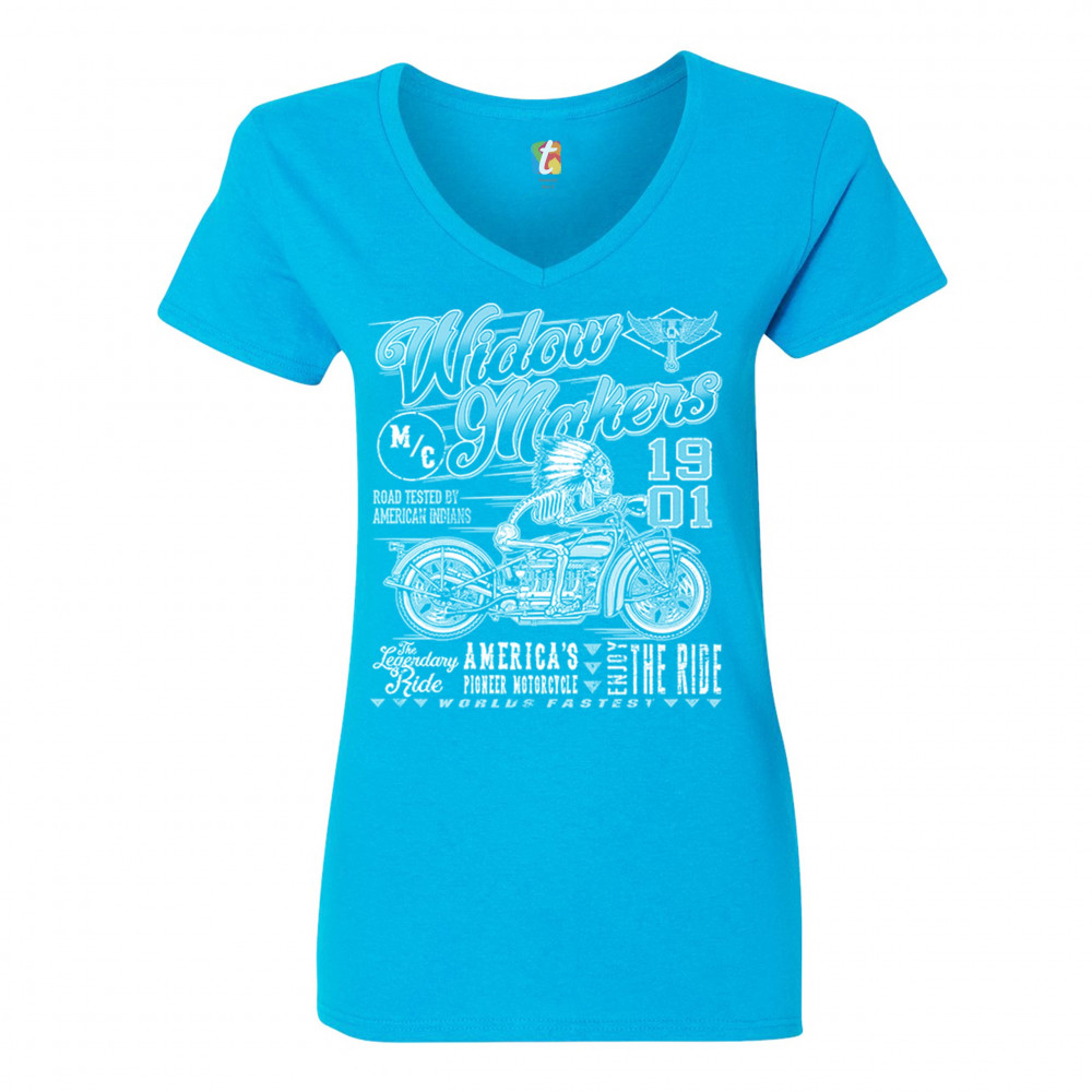 M/C WIDOWMAKERS 1901 women's v-neck t-shirt native american bikers bobber tee turquoise